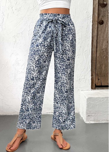 Added Successfully Blue Floral Print Wide Leg Elastic Waist Pants