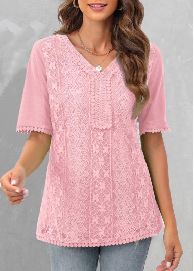 Light Pink Lace Half Sleeve Split Neck Blouse