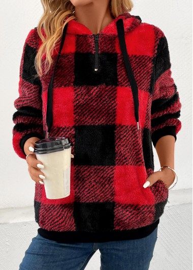 Red Pocket Plaid Long Sleeve Hooded Sweatshirt
