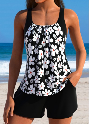 Added Successfully Tummy Coverage Mid Waisted Floral Print Black Tankini Set