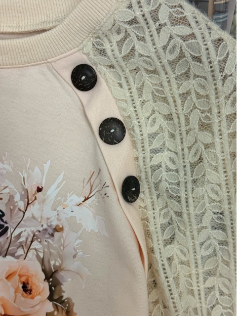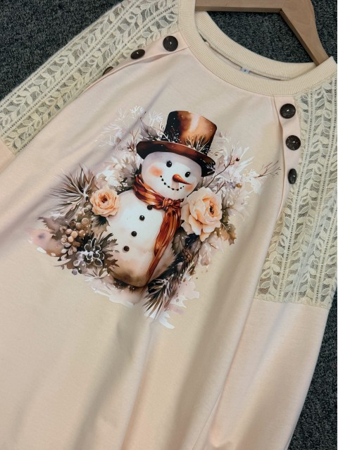 Wrap yourself in festive charm with this cozy off-white Christmas sweatshirt. Featuring delicate lace patchwork and decorative buttons along the sleeves, it showcases a playful snowman print on the front. The soft, comfy fabric and tunic-length cut offer perfect tummy coverage, making it ideal for everyday wear and holiday celebrations alike.