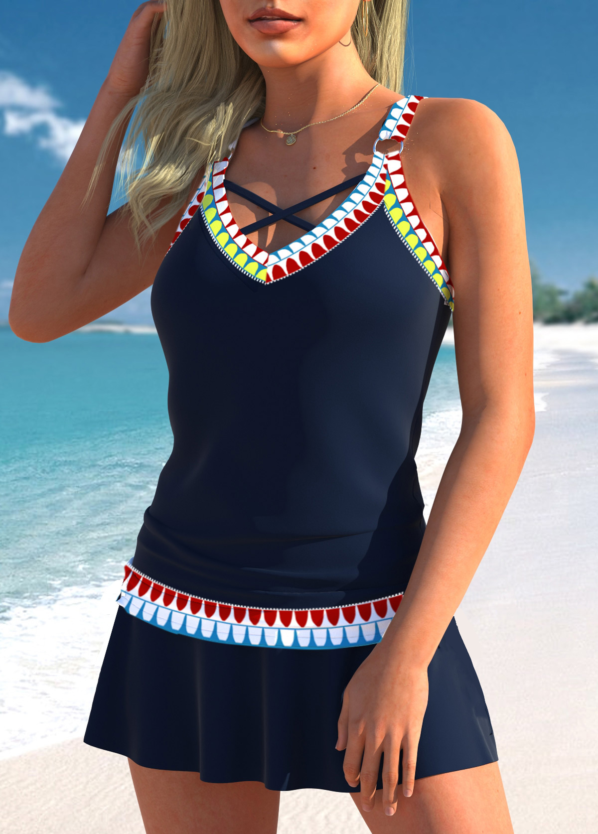 women's clothes / Swimwear / Tankinis / Tankini Sets  /  Circular Ring Low Waisted Tribal Print Navy Tankini Set