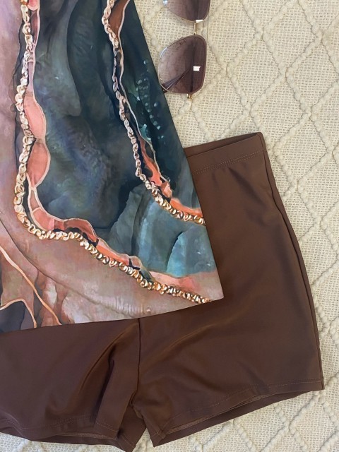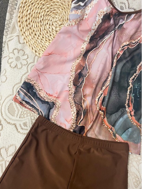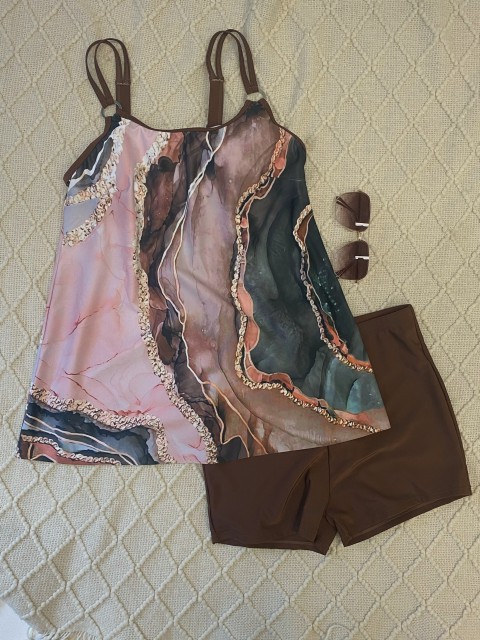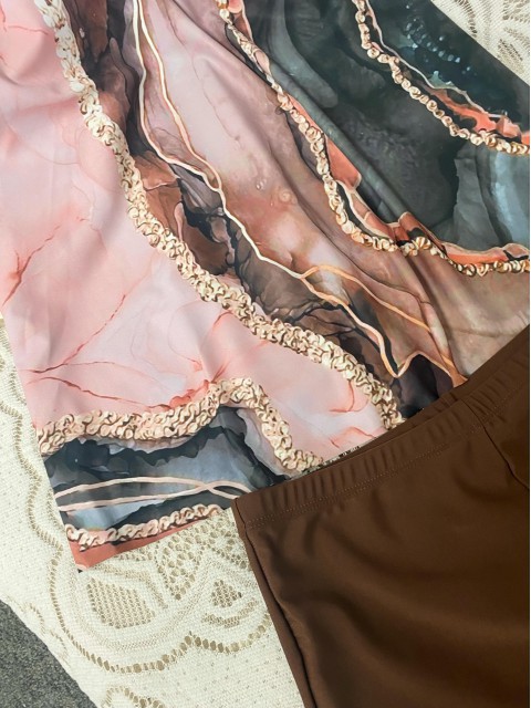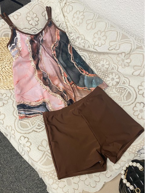 Ruffle Geometric Print Light Coffee Tankini Top