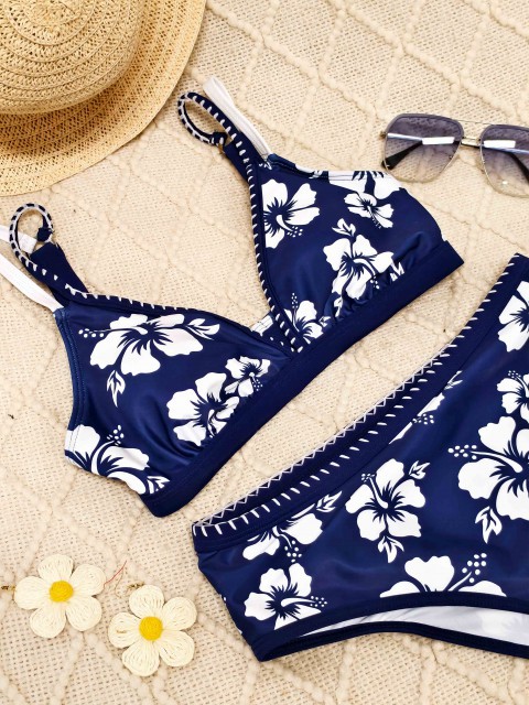 Contrast Binding Mid Waisted Floral Print Navy Bikini Set