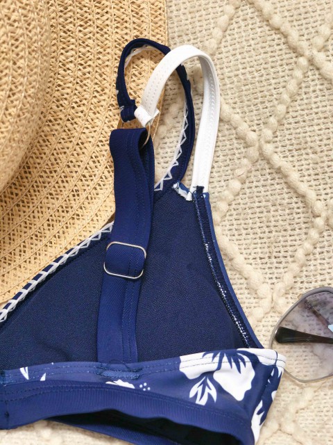 Home  /  Swimwear  /  Bikinis  /  Bikini Sets  /  Contrast Binding Mid Waisted Floral Print Navy Bikini Set