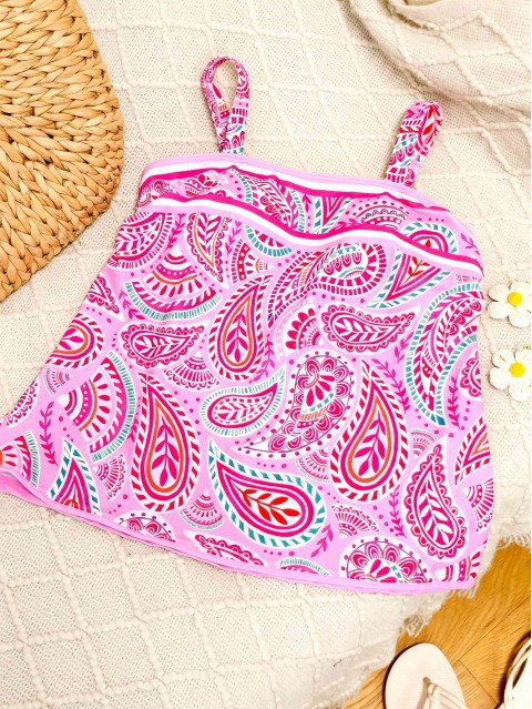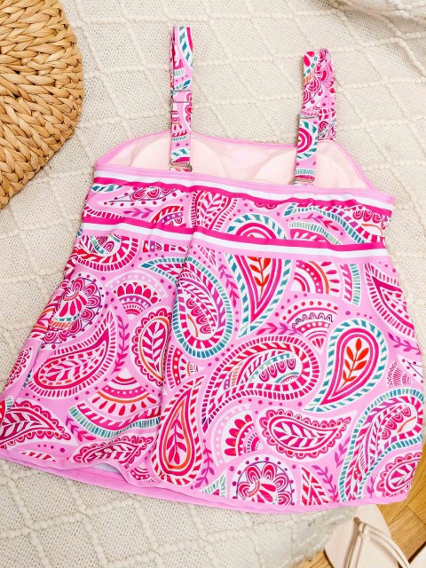 Ruched Mid Waisted Paisley Print Pink Tankini Set