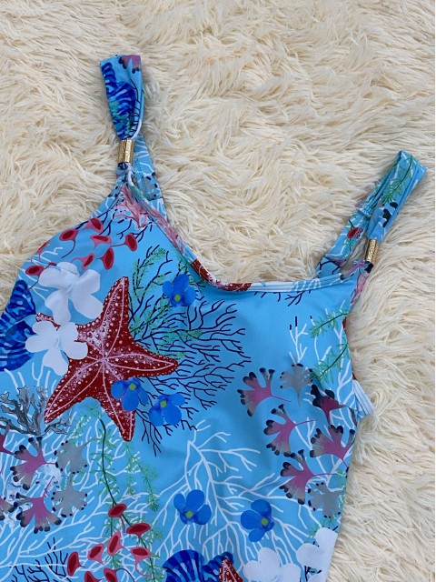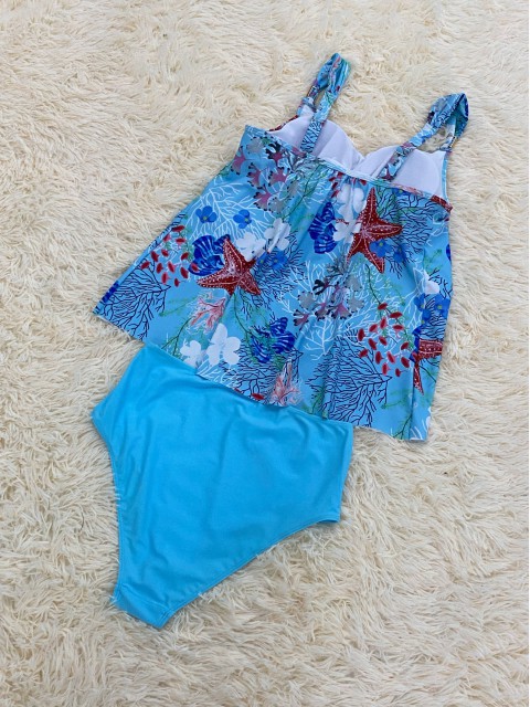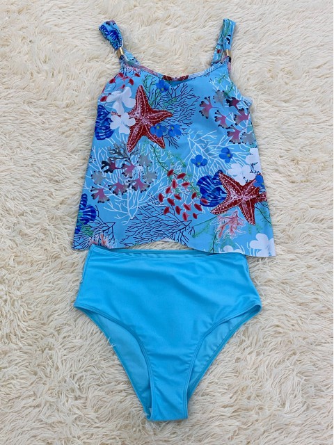 Mid Waisted Marine Life Print Light Blue Tankini Set