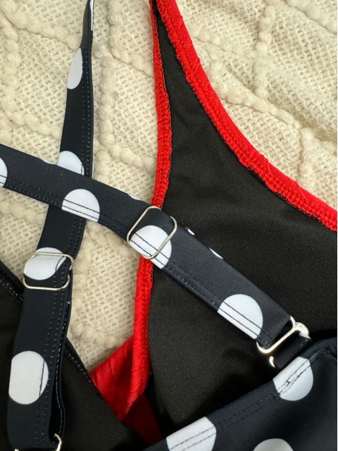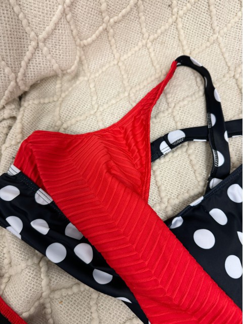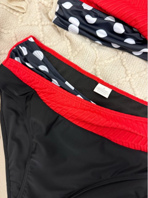 Turn heads with this bold black-and-red contrast bikini set! Featuring playful polka dot prints and textured paneling, its sexy, flattering cut adds just the right touch of allure. Perfect for making a striking statement by the pool or beach.