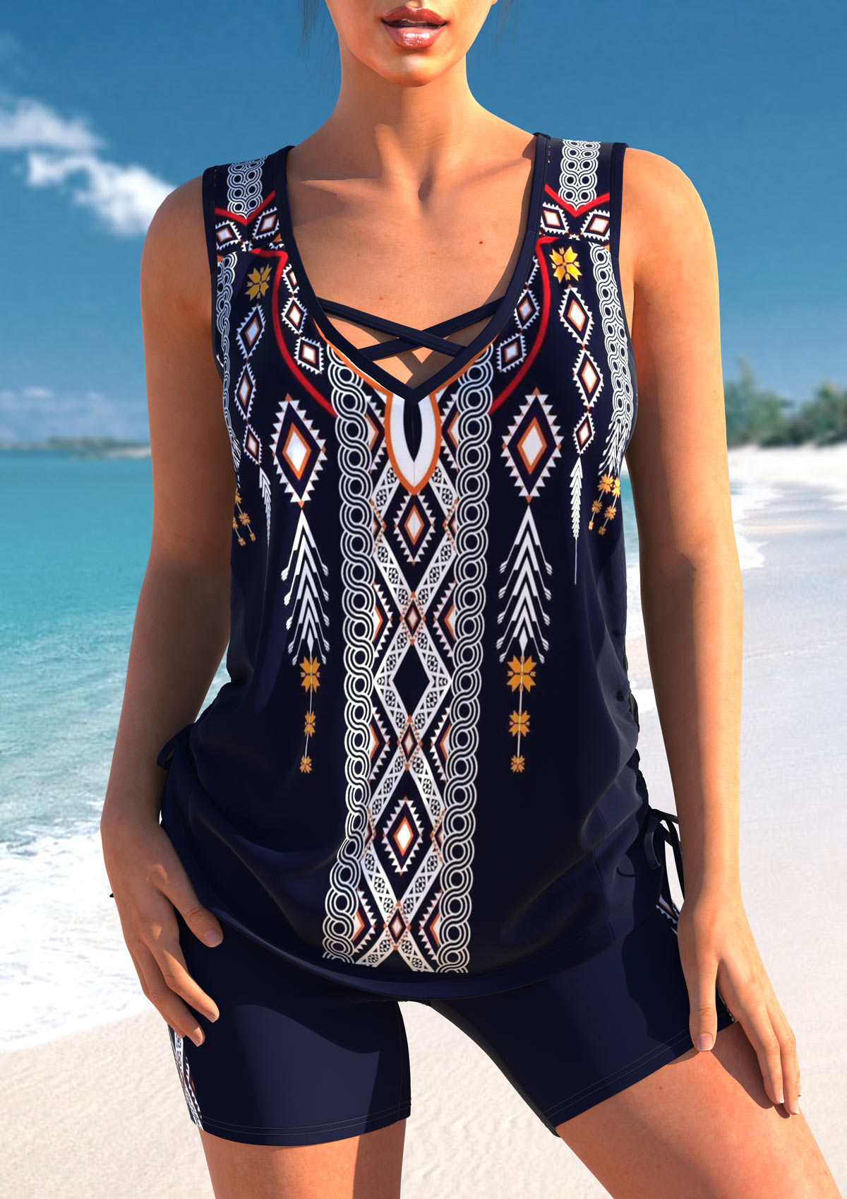• Criss Cross Tribal Print Navy Tankini Top-No Bottom | thumb picture