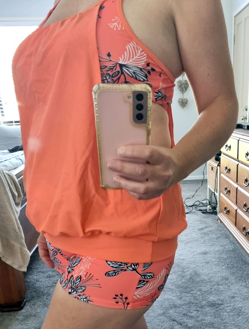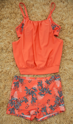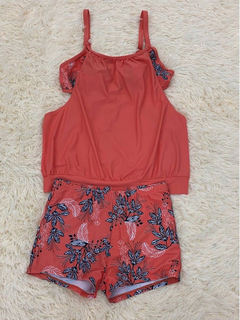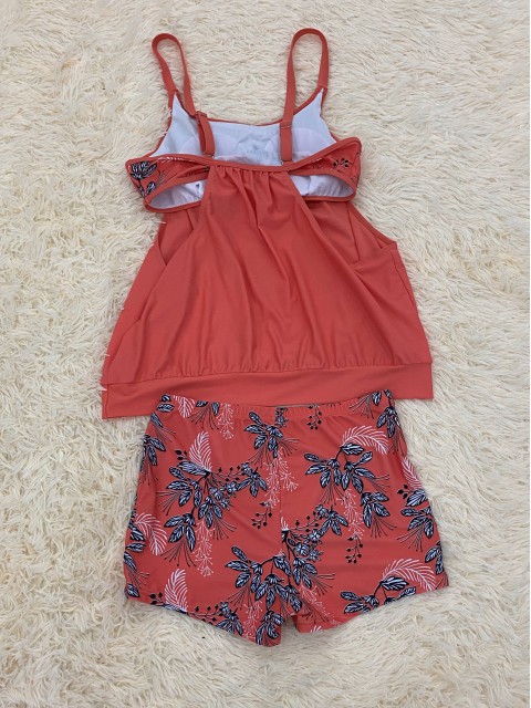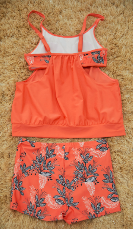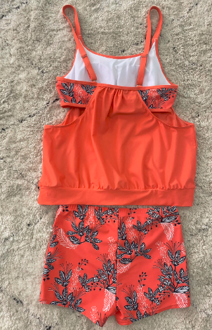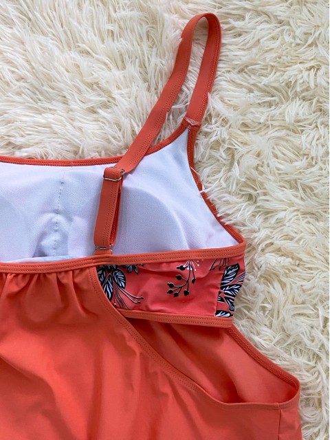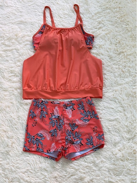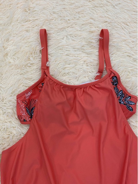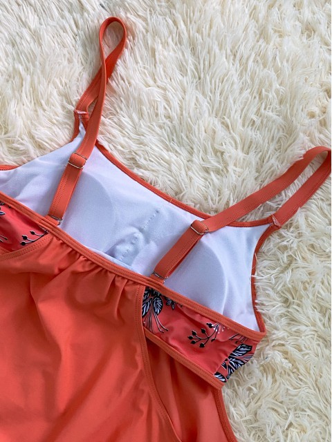 Mid Waisted Tropical Plants Print Orange Tankini Set