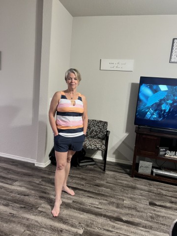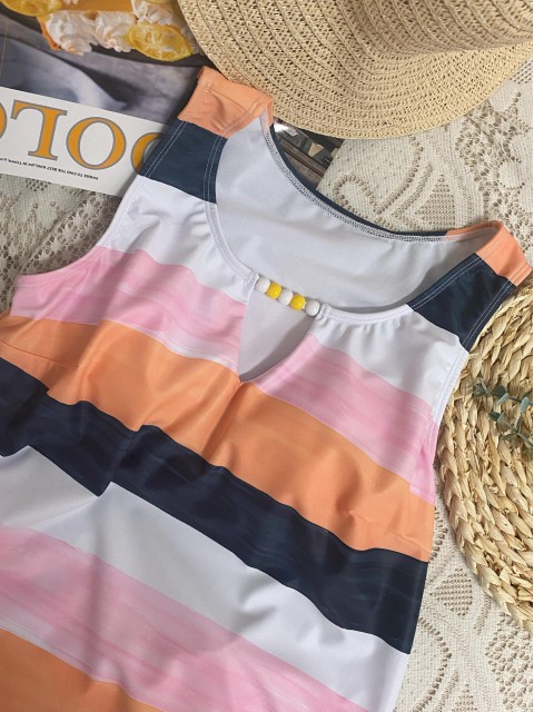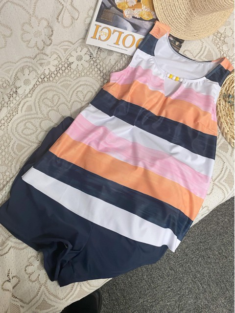 Get ready to shine in our tankini set! It includes a tank-style top and hipster bottoms with vibrant mixed stripes, ideal for beach adventures. The top has a chic cut-out design with dazzling bead embellishments, while the bottoms have handy pockets. With built-in tummy coverage, it's the ultimate vacation essential!