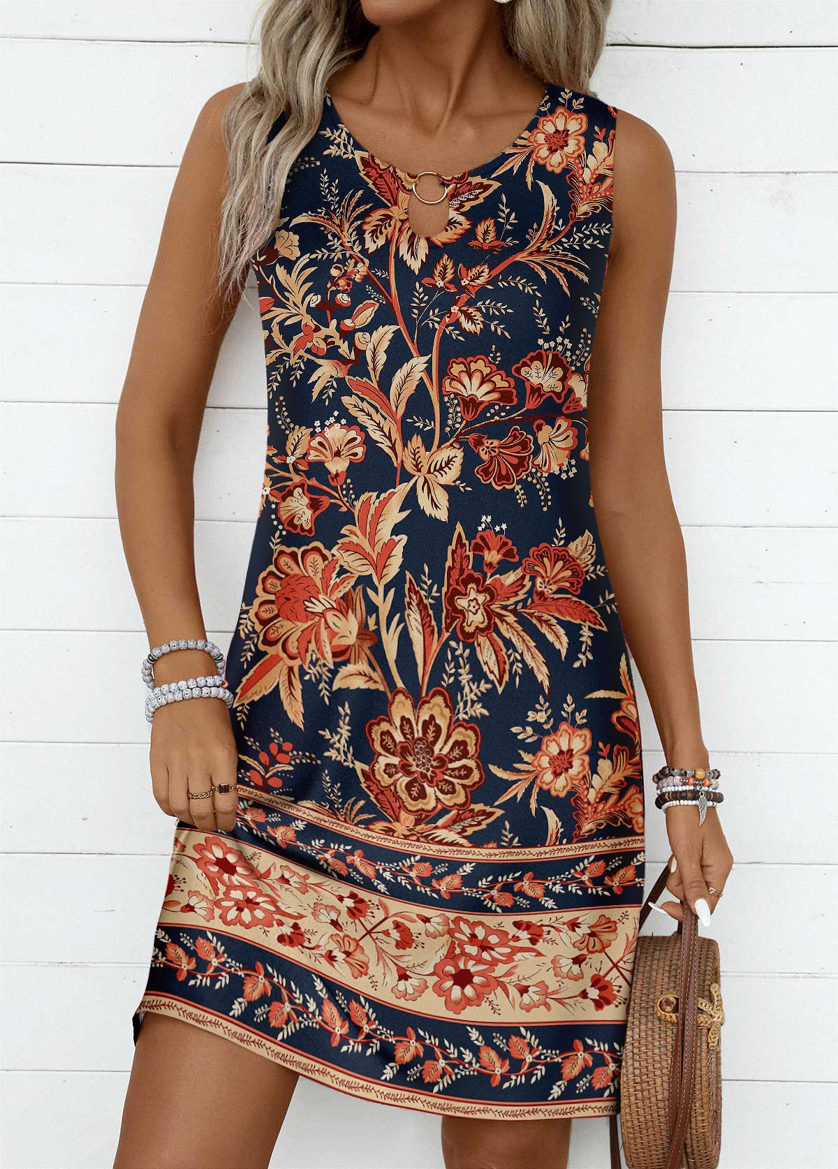 women's clothes / Dresses  /  Dark Blue Circular Ring Floral Print Sleeveless Dress