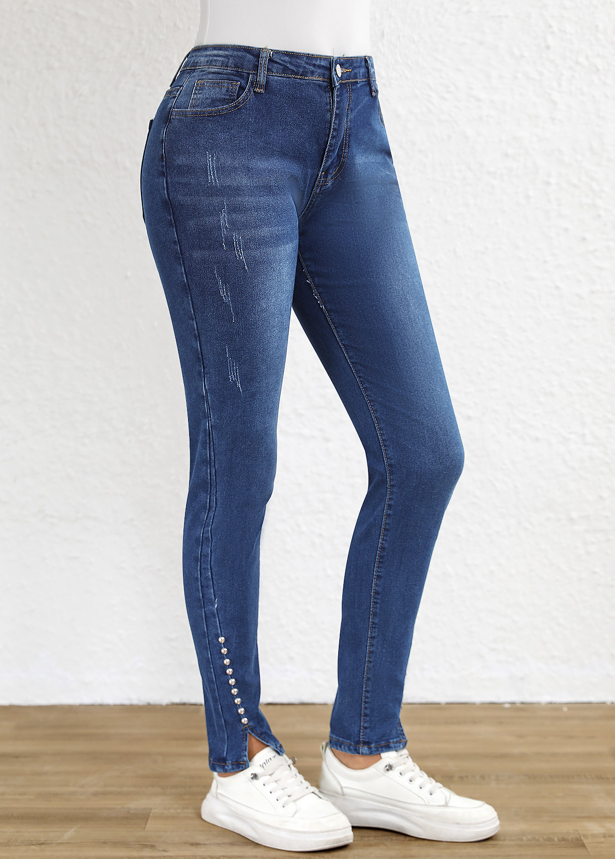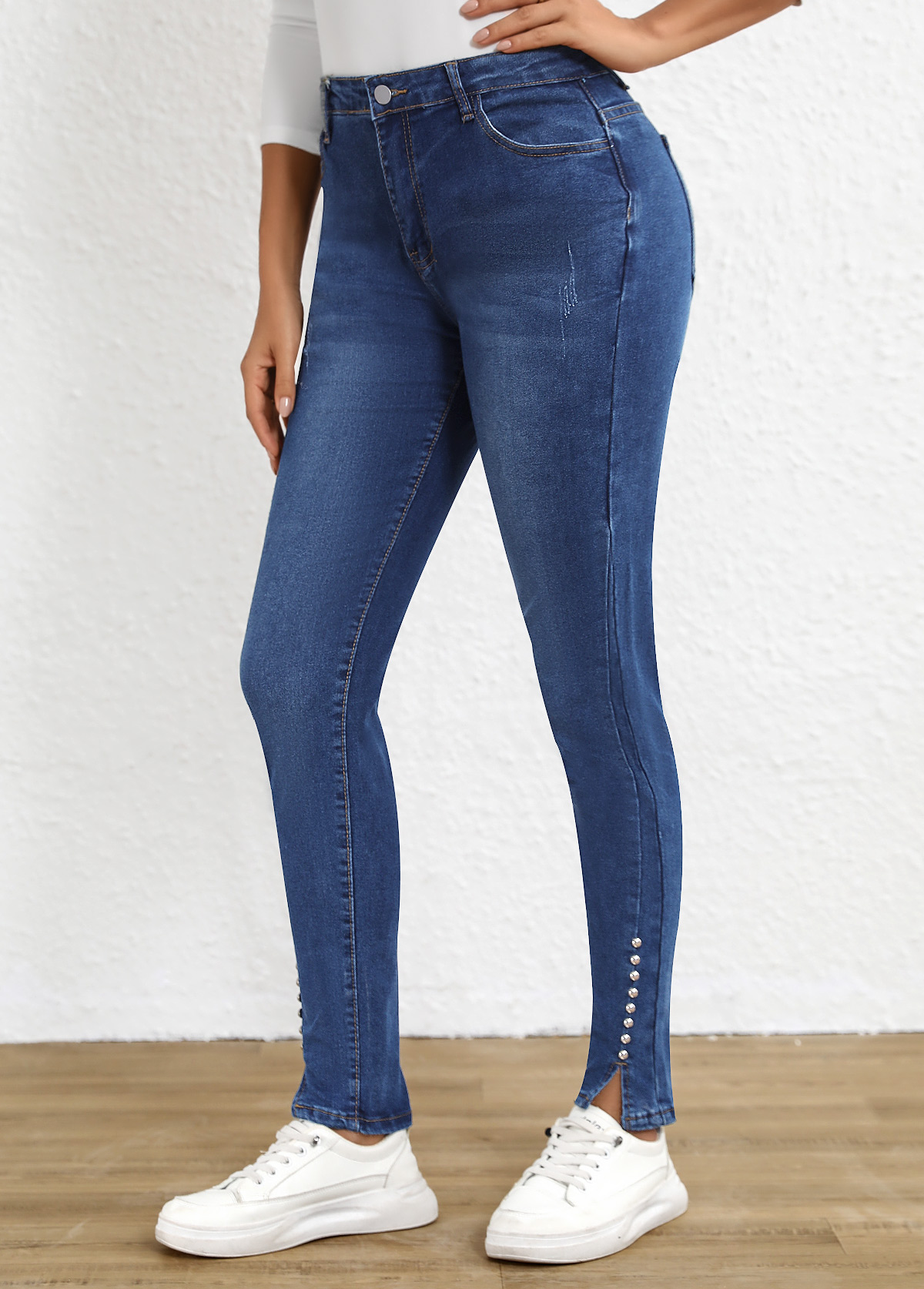 women's clothes / Bottoms / Denim&Jeans  /  Dark Blue Split Skinny Button Fly High Waisted Jeans