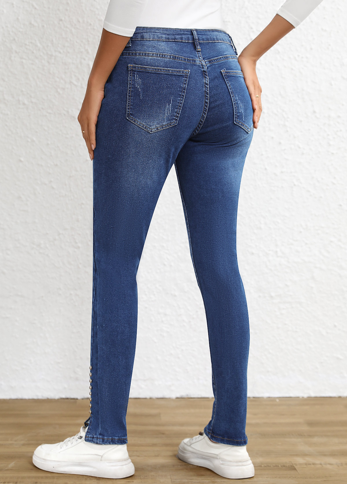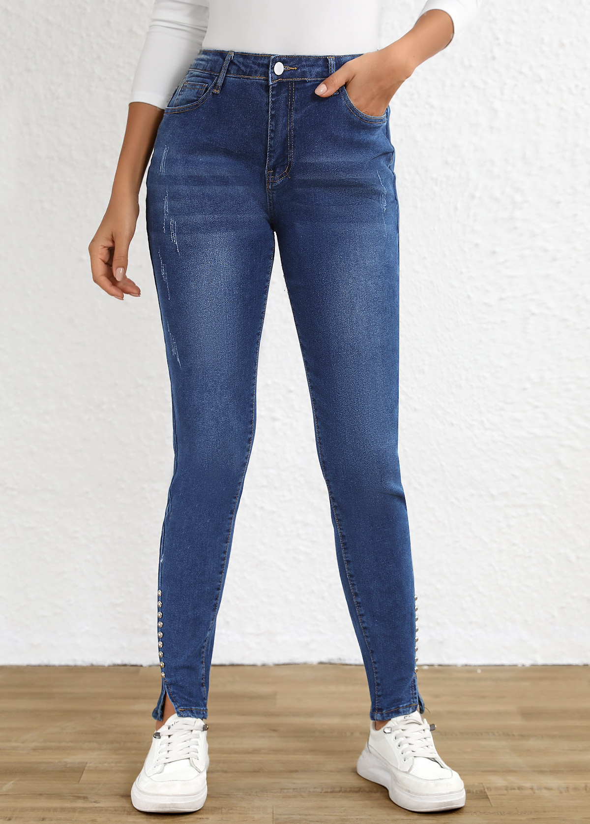 Dark Blue Split Skinny Button Fly High Waisted Jeans