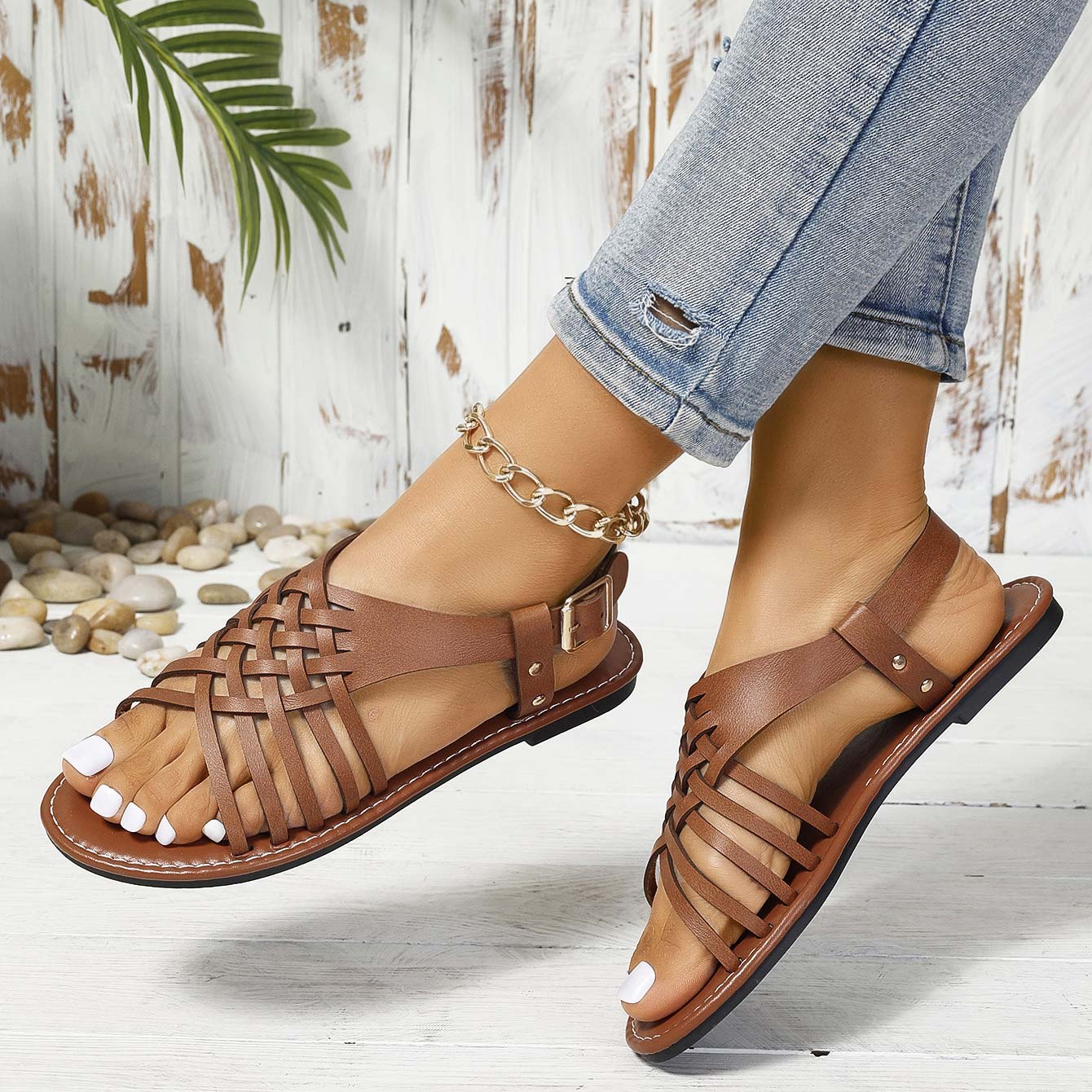 women's clothes / Shoes / Sandals  /  Dark Coffee Faux Leather Peep Toe Falt