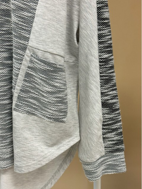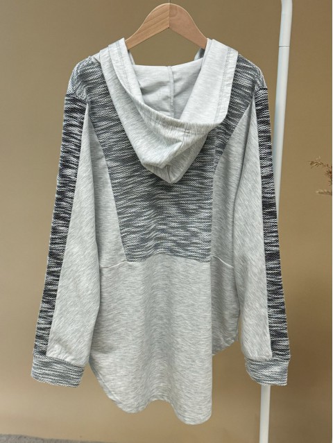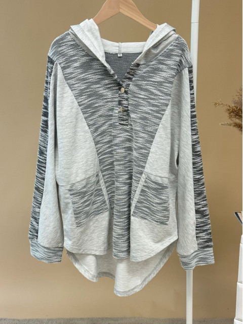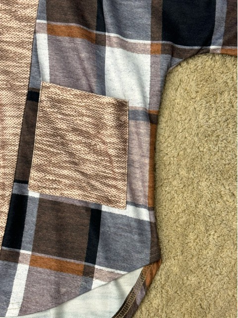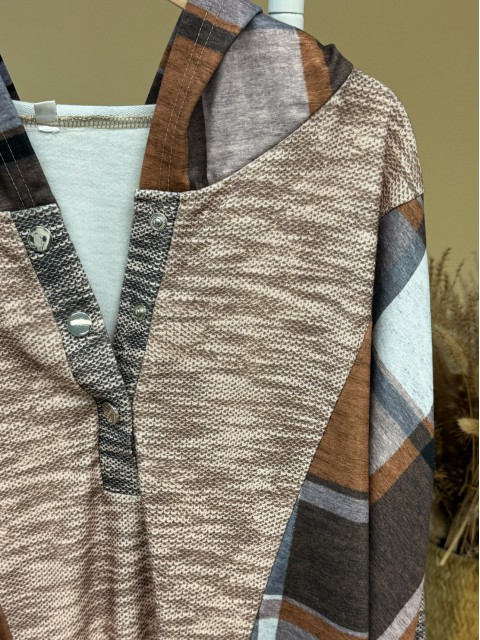 Cozy up in this unique hoodie featuring a deep brown plaid and solid color patchwork design. With body sleeves and a soft knit fabric, it offers ultimate comfort. The snap button neckline and tunic length make it a stylish choice for everyday wear.