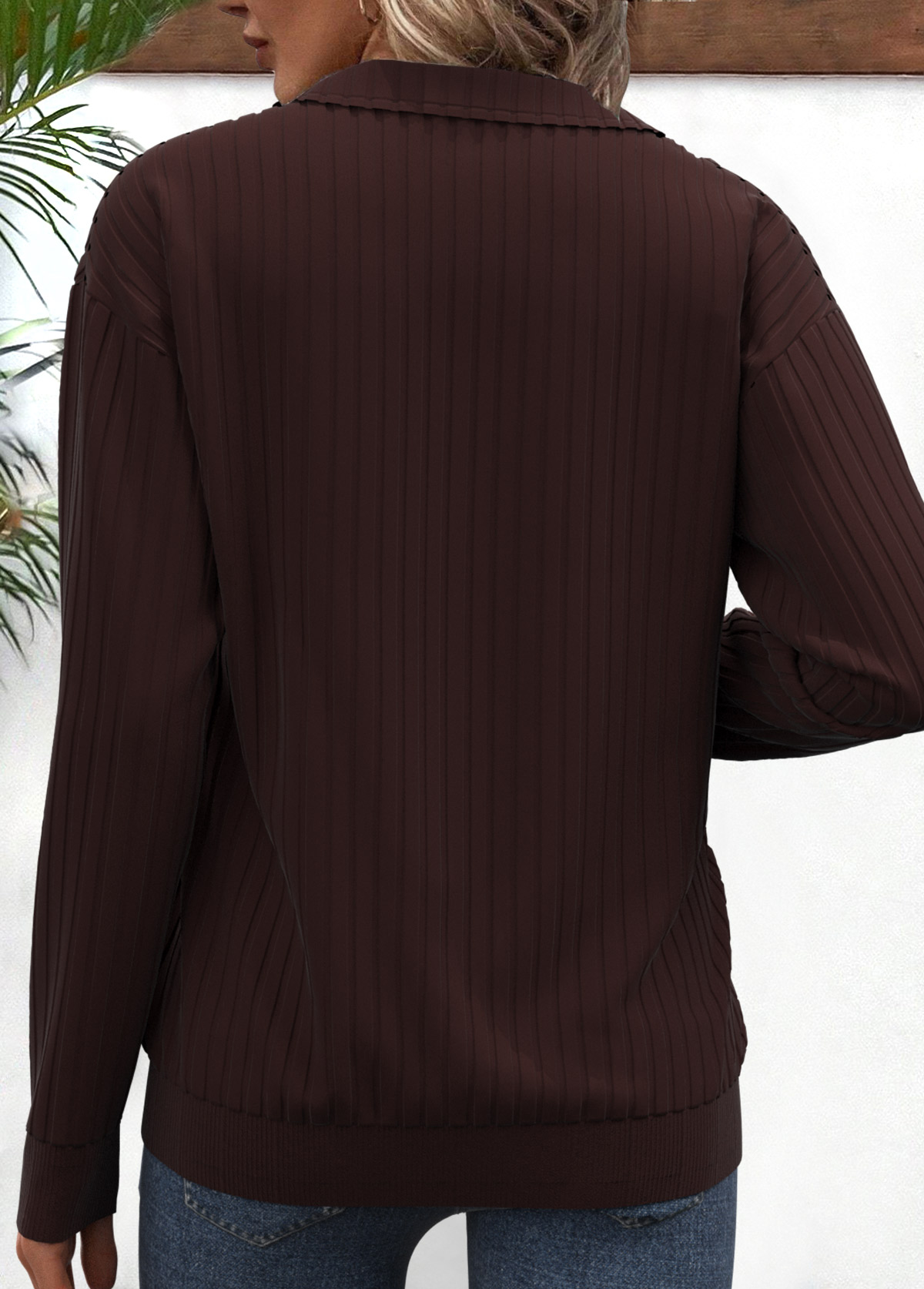women's clothes / Tops / Sweatshirts&Hoodies  /  Dark Coffee Zipper Plaid Long Sleeve V Neck Sweatshirt