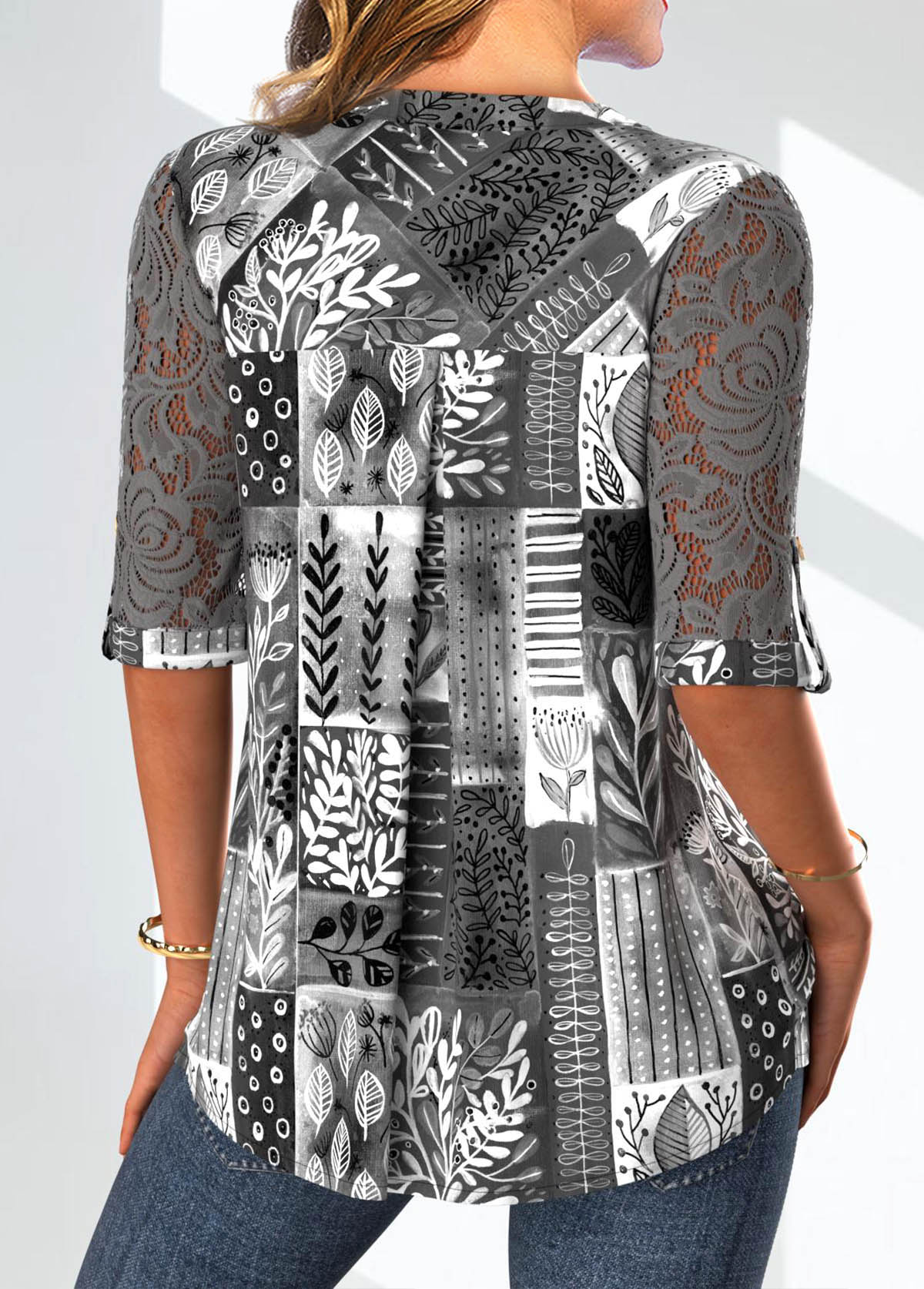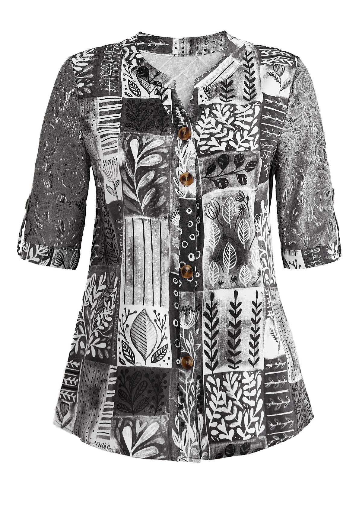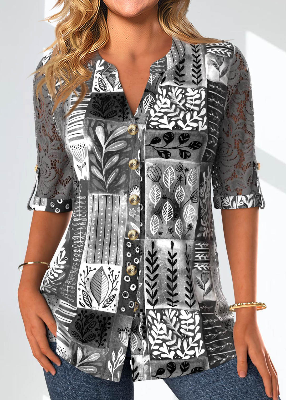 Light Pink Button Geometric Print 3/4 Sleeve Blouse