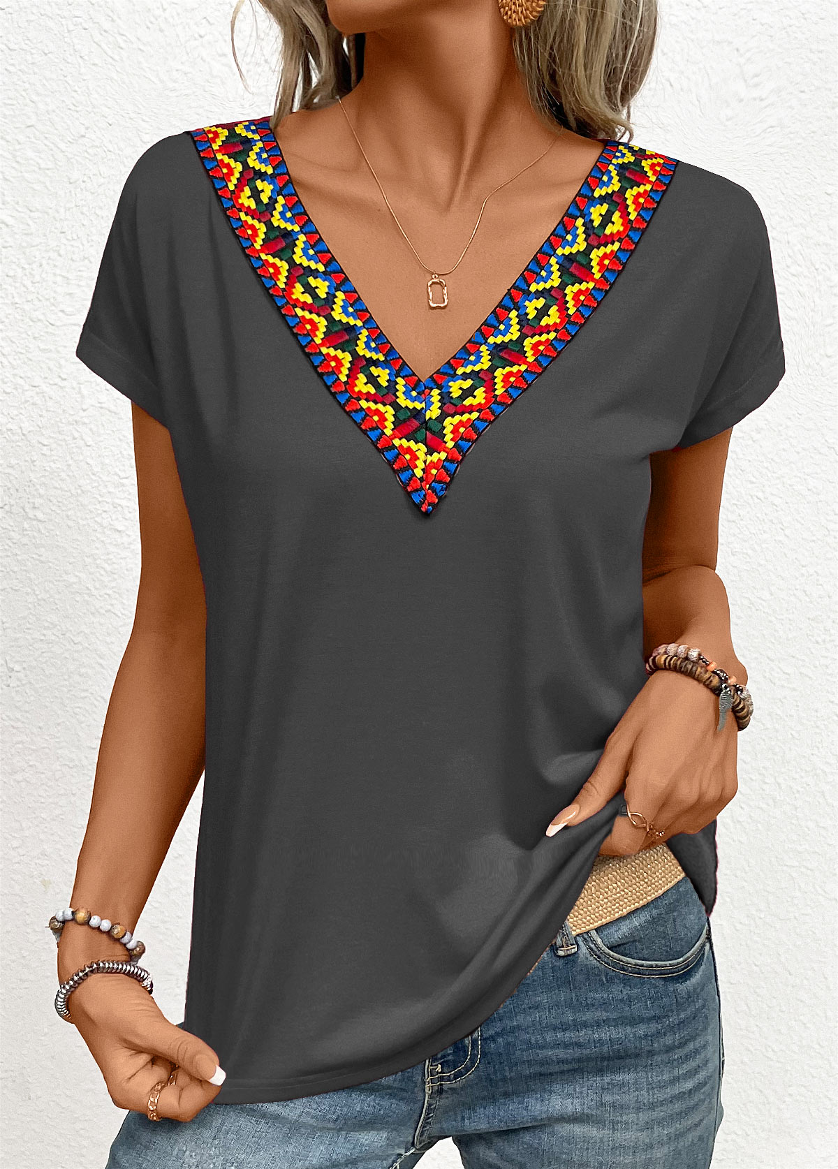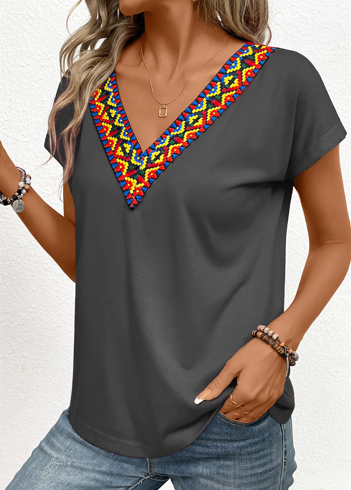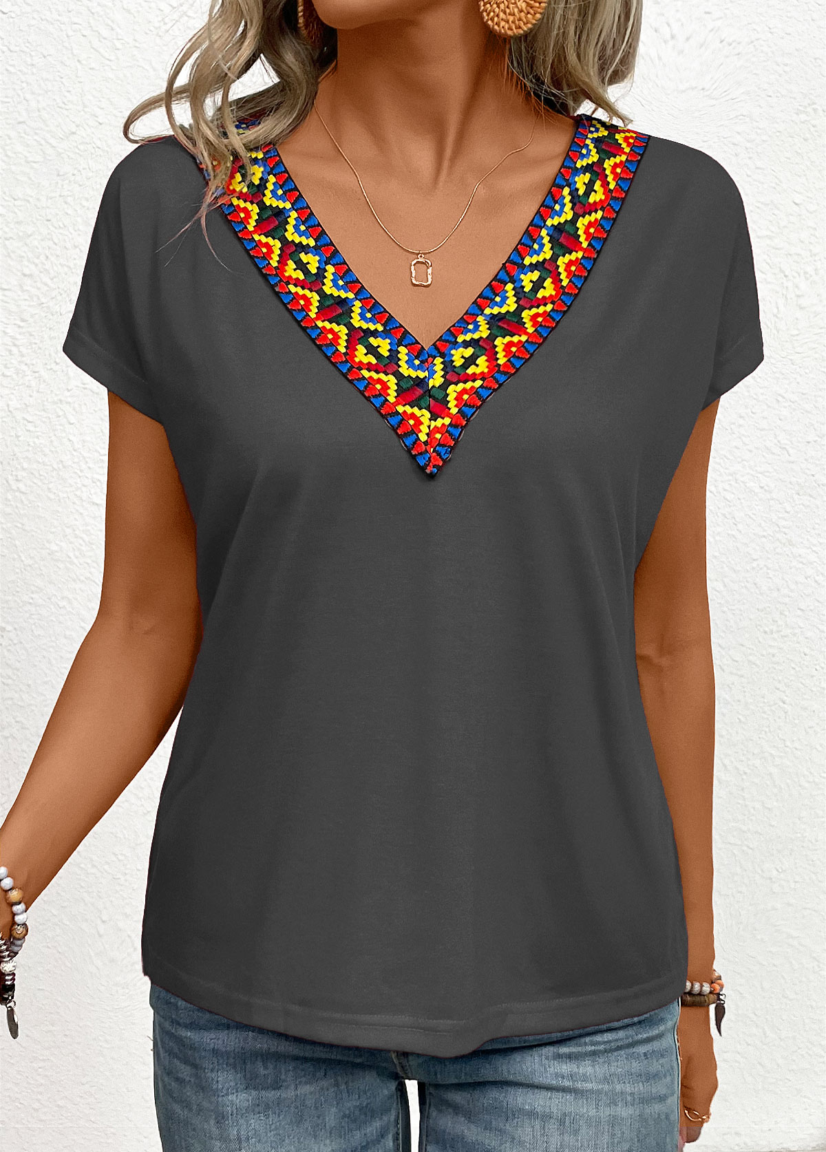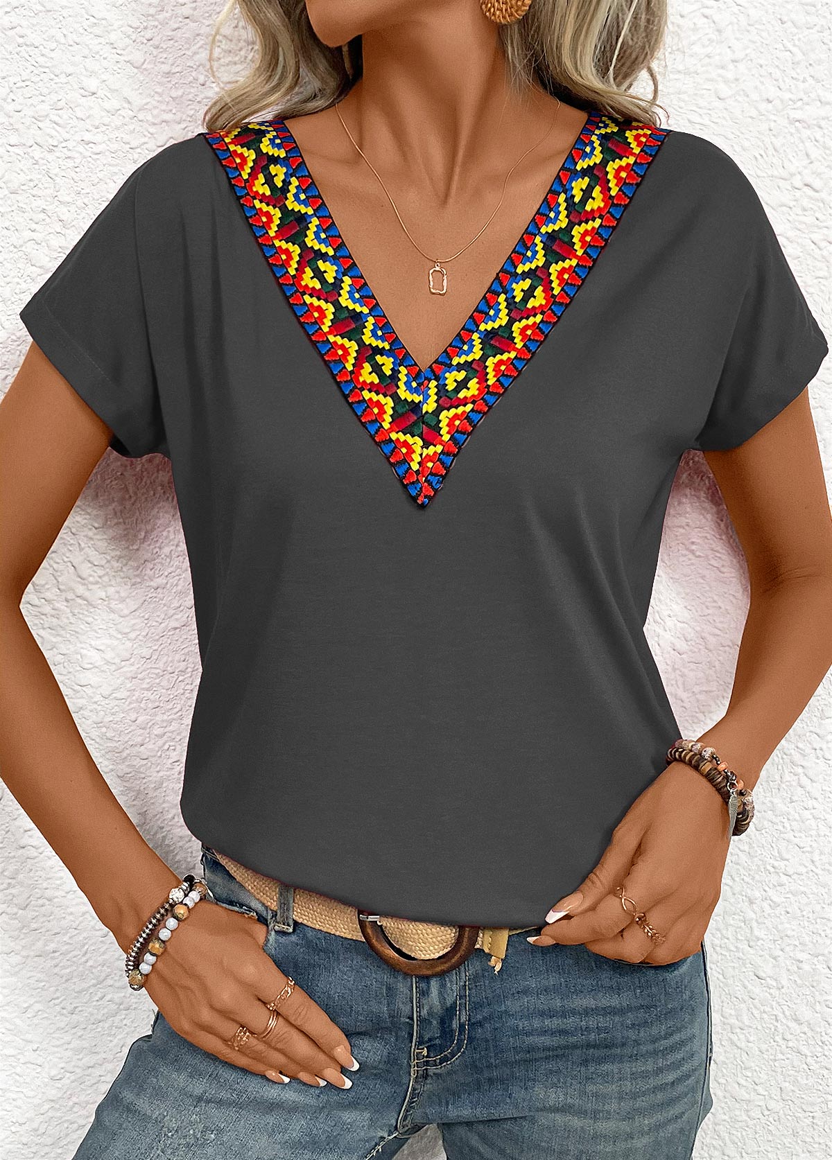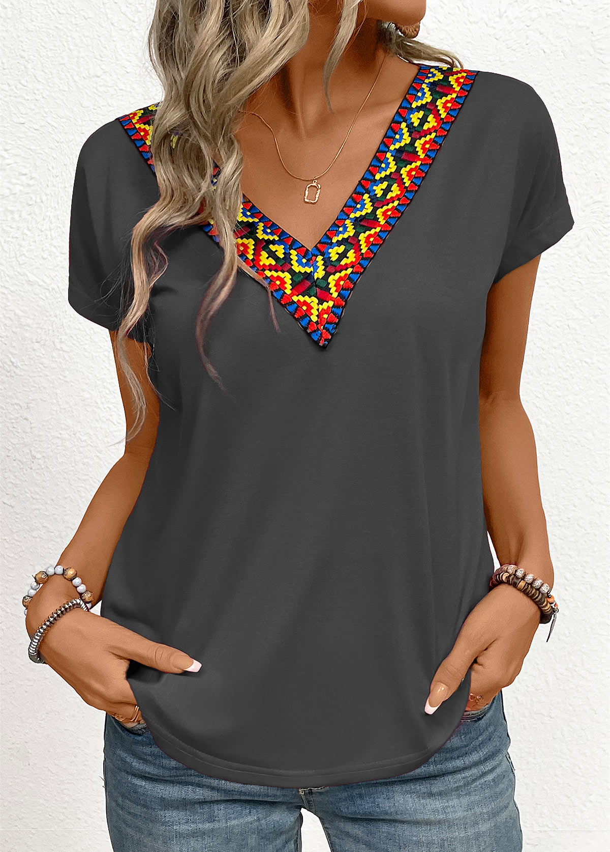 Light Pink Patchwork Short Sleeve V Neck T Shirt