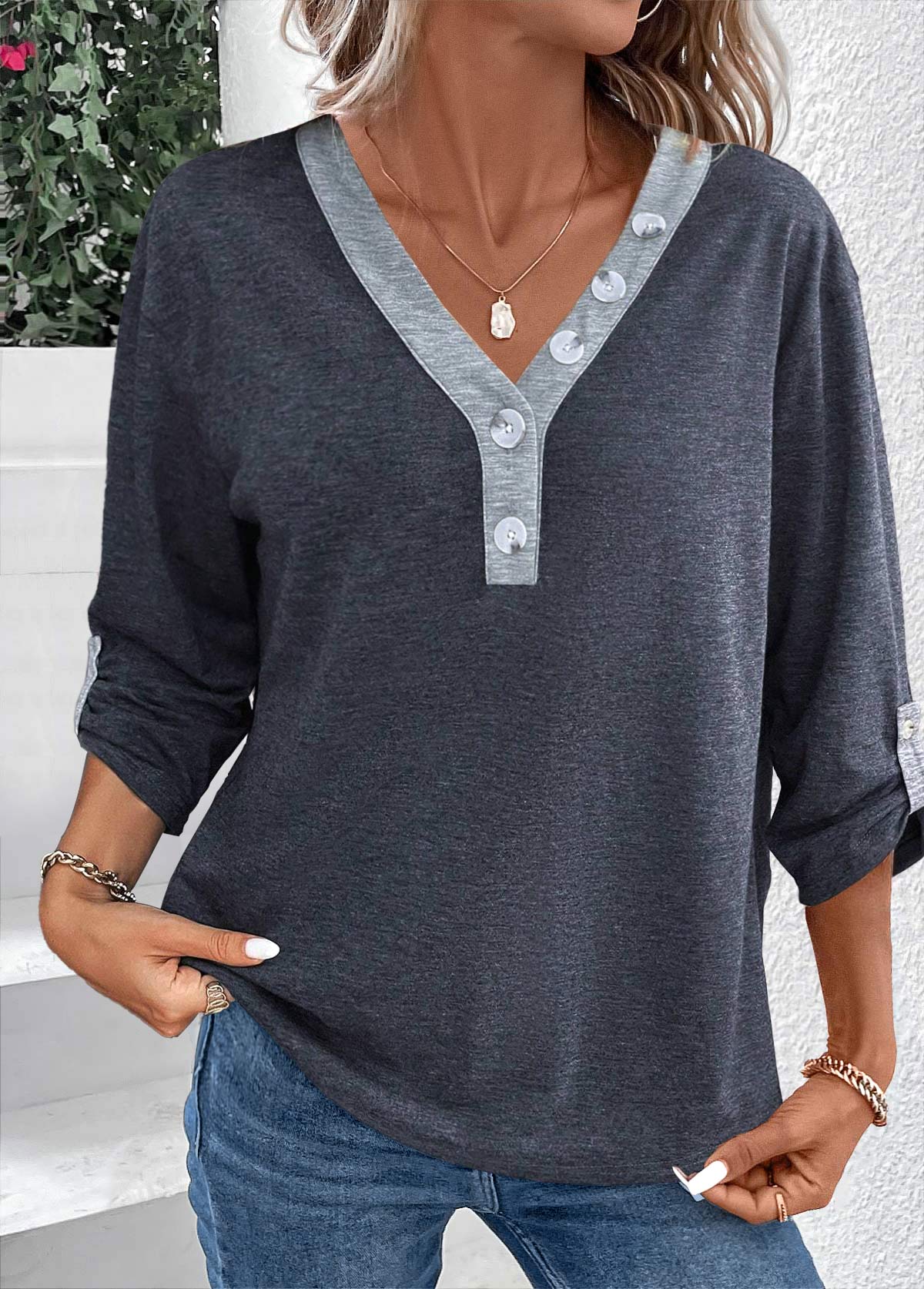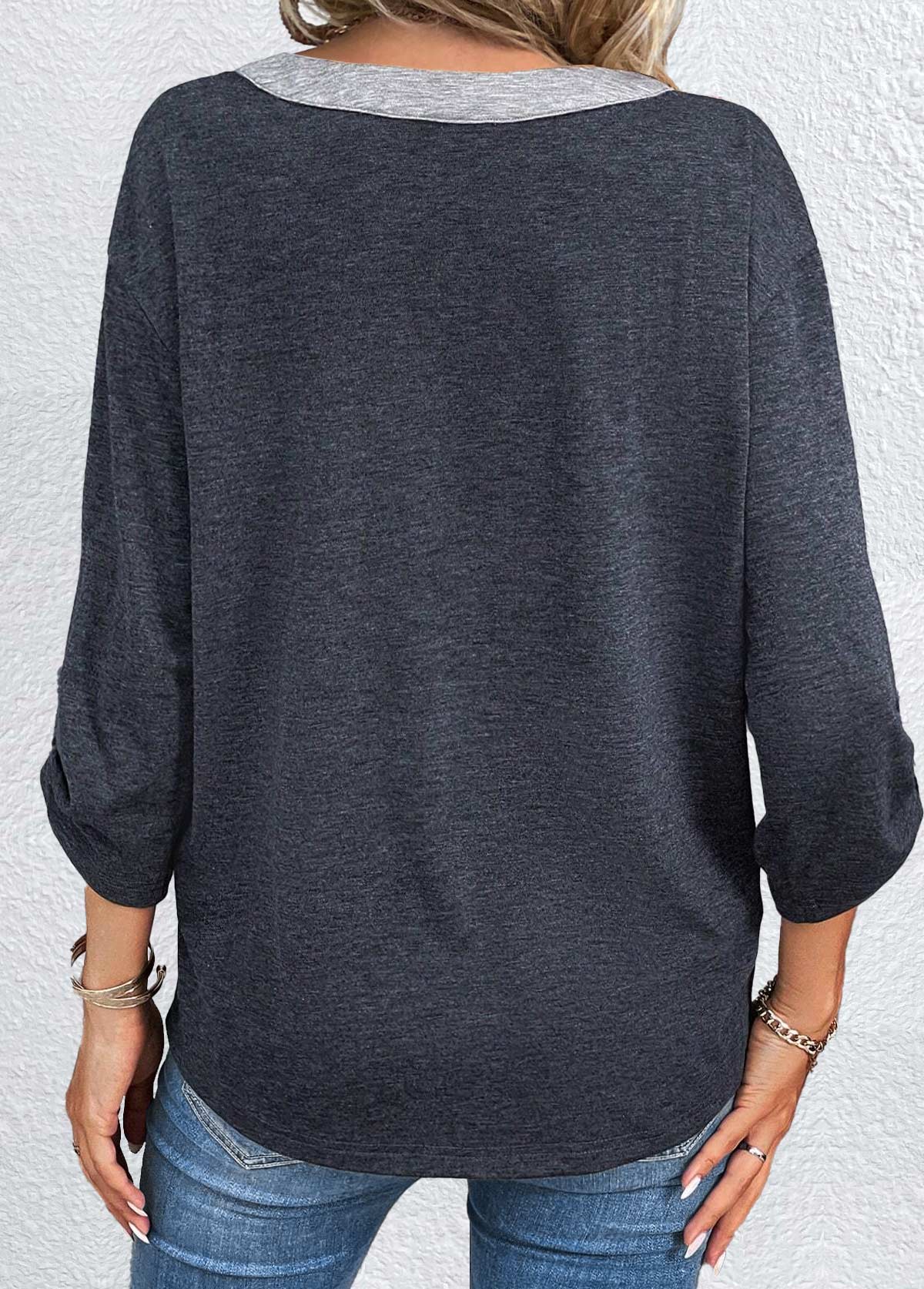 Black Patchwork Geometric Print Split Neck Sweatshirt