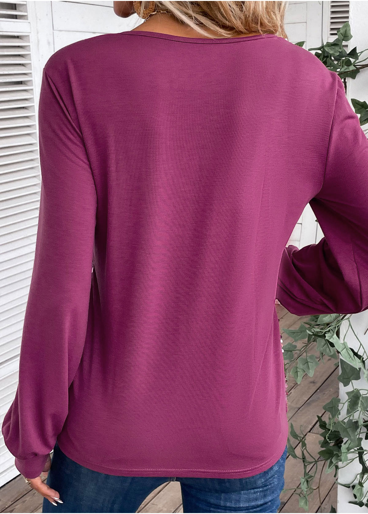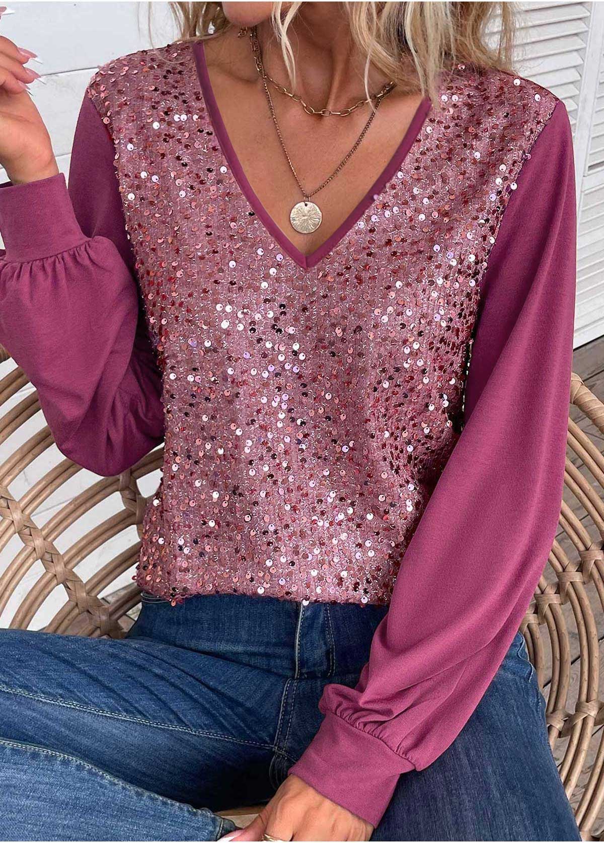Dark Reddish Purple Sequin Long Sleeve V Neck Blouse