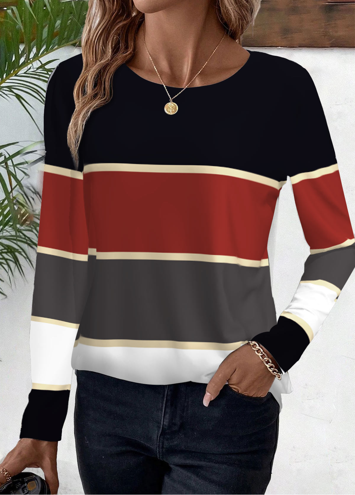 Multi Color Striped Long Sleeve Round Neck T Shirt