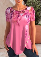Pink Floral Print Tummy Coverage Short Sleeve T Shirt