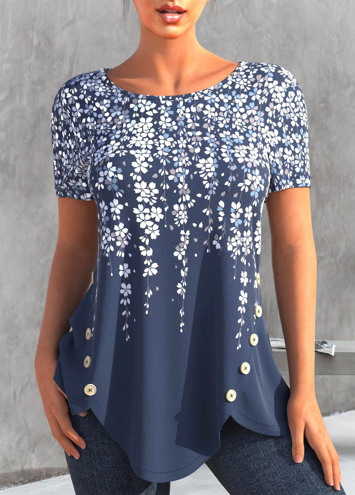 Pink Ditsy Floral Print Curved Hem T Shirt