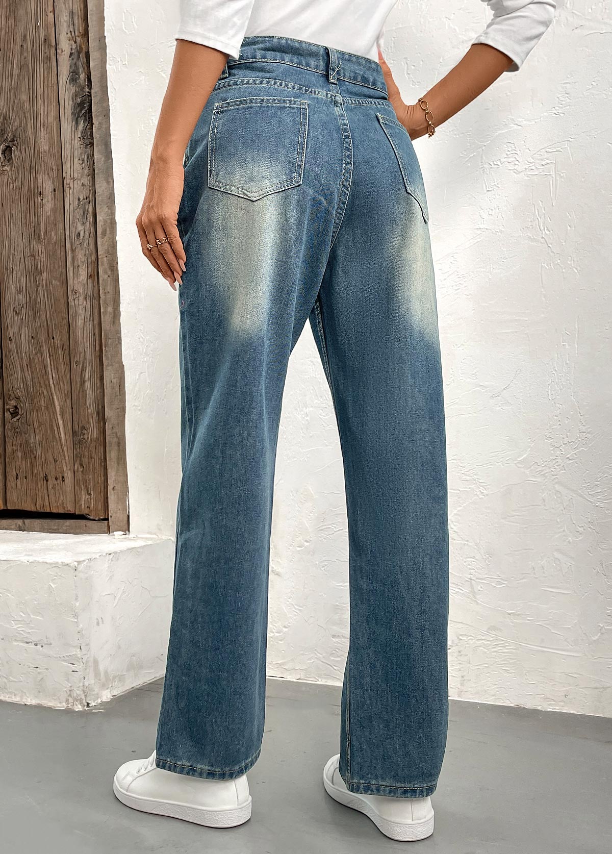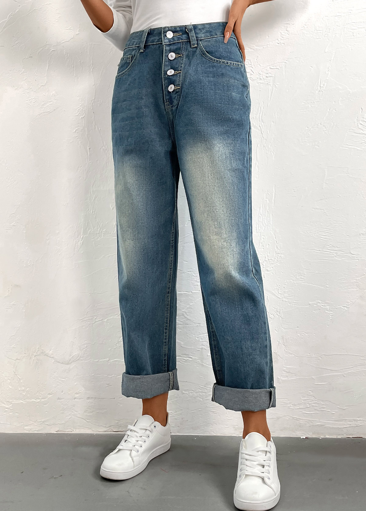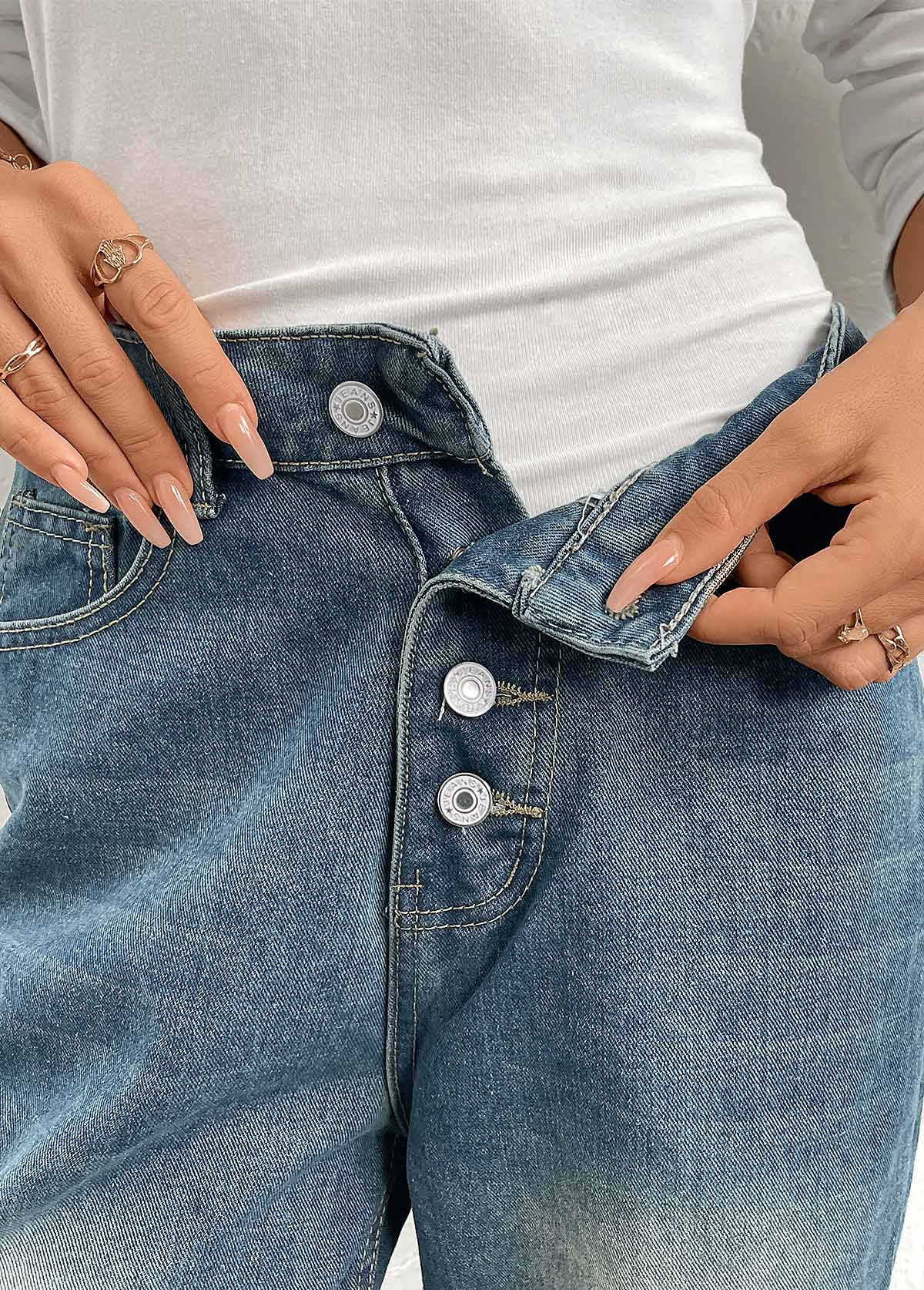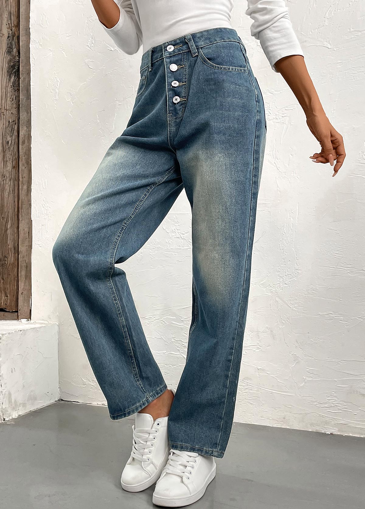 women's clothes / Bottoms / Pants  /  Denim Blue Button Straight Leg High Waisted Jeans
