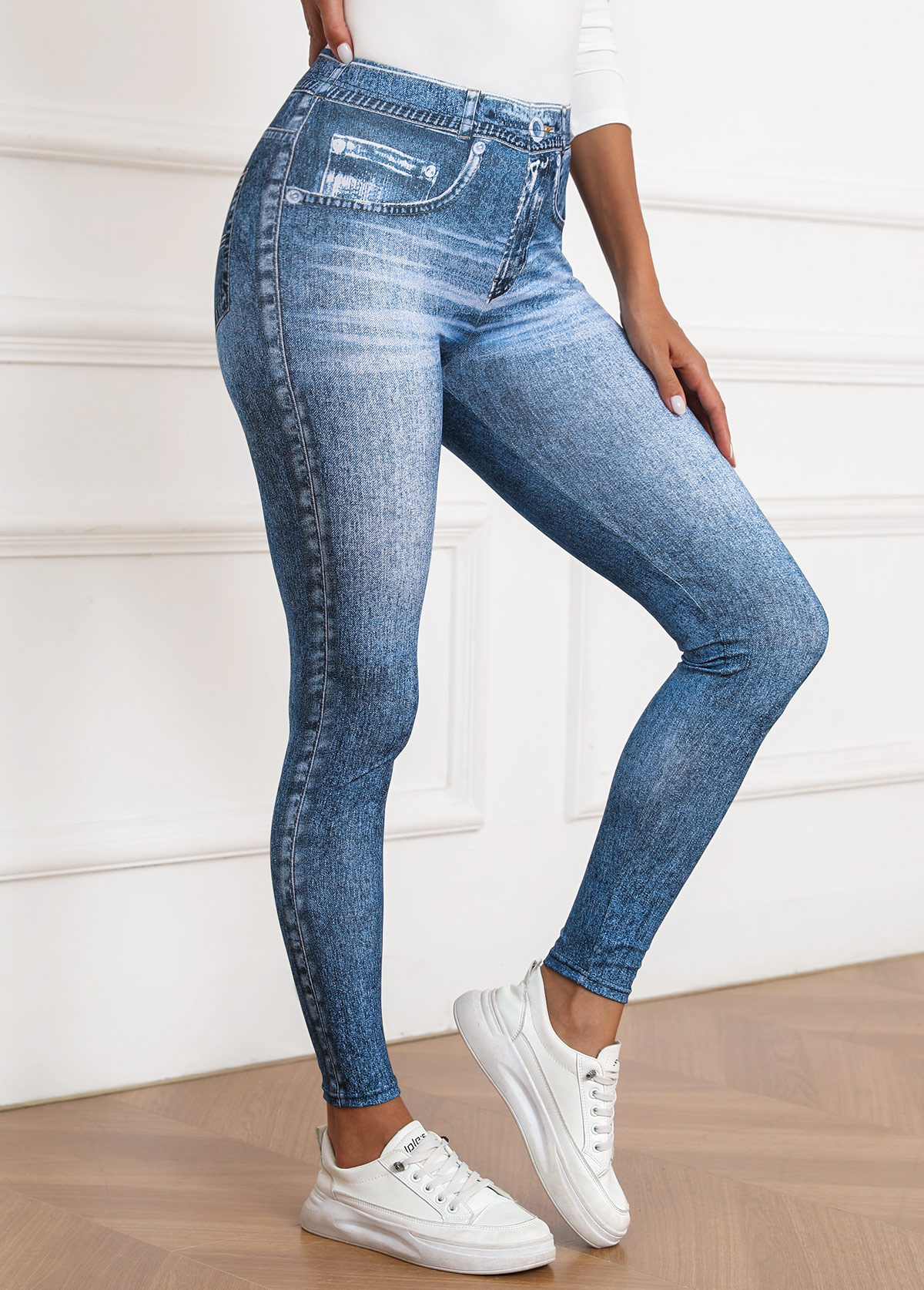 Denim Blue Denim-effect Print Skinny Elastic Waist Pants