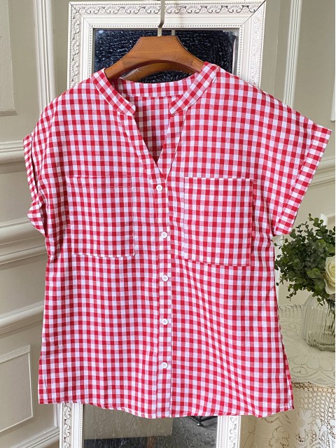 Red Double Side Pockets Plaid Sleeveless Stand Collar Waistcoat