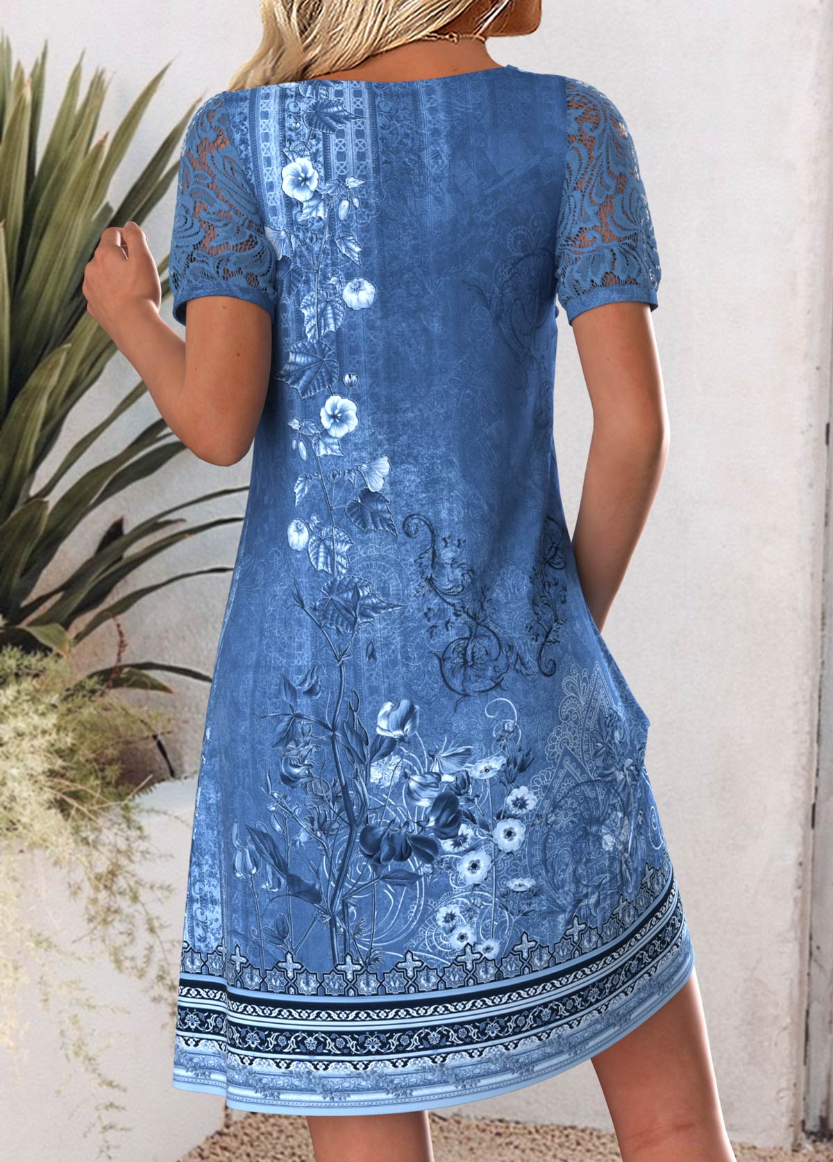 Denim Blue Tribal Print Short Sleeve Round Neck Dress