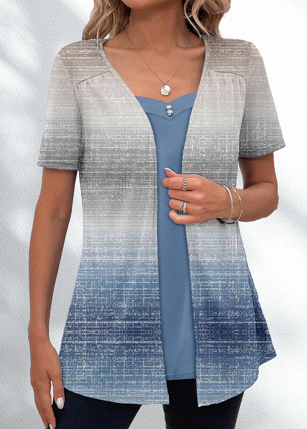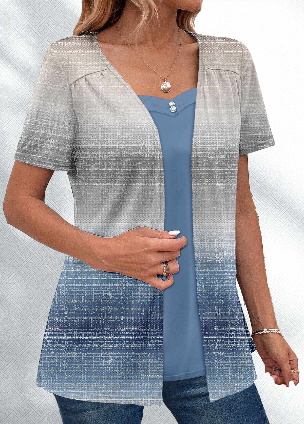women's clothes / Tops / Blouses  /  Dusty Blue Ombre Short Sleeve Fake Two Piece Twinset