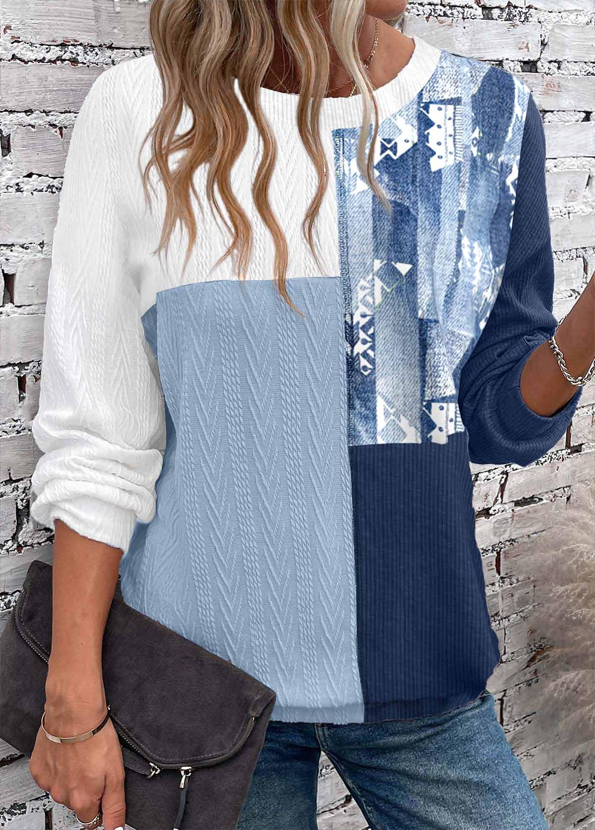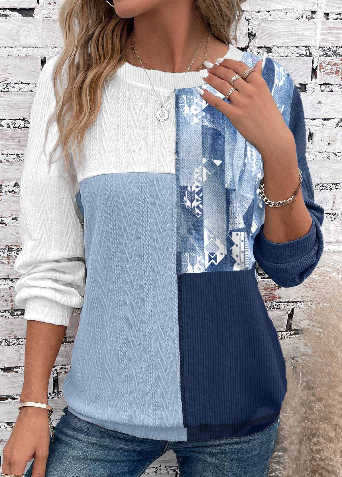 Dusty Blue Tummy Coverage Geometric Print Long Sleeve Sweatshirt