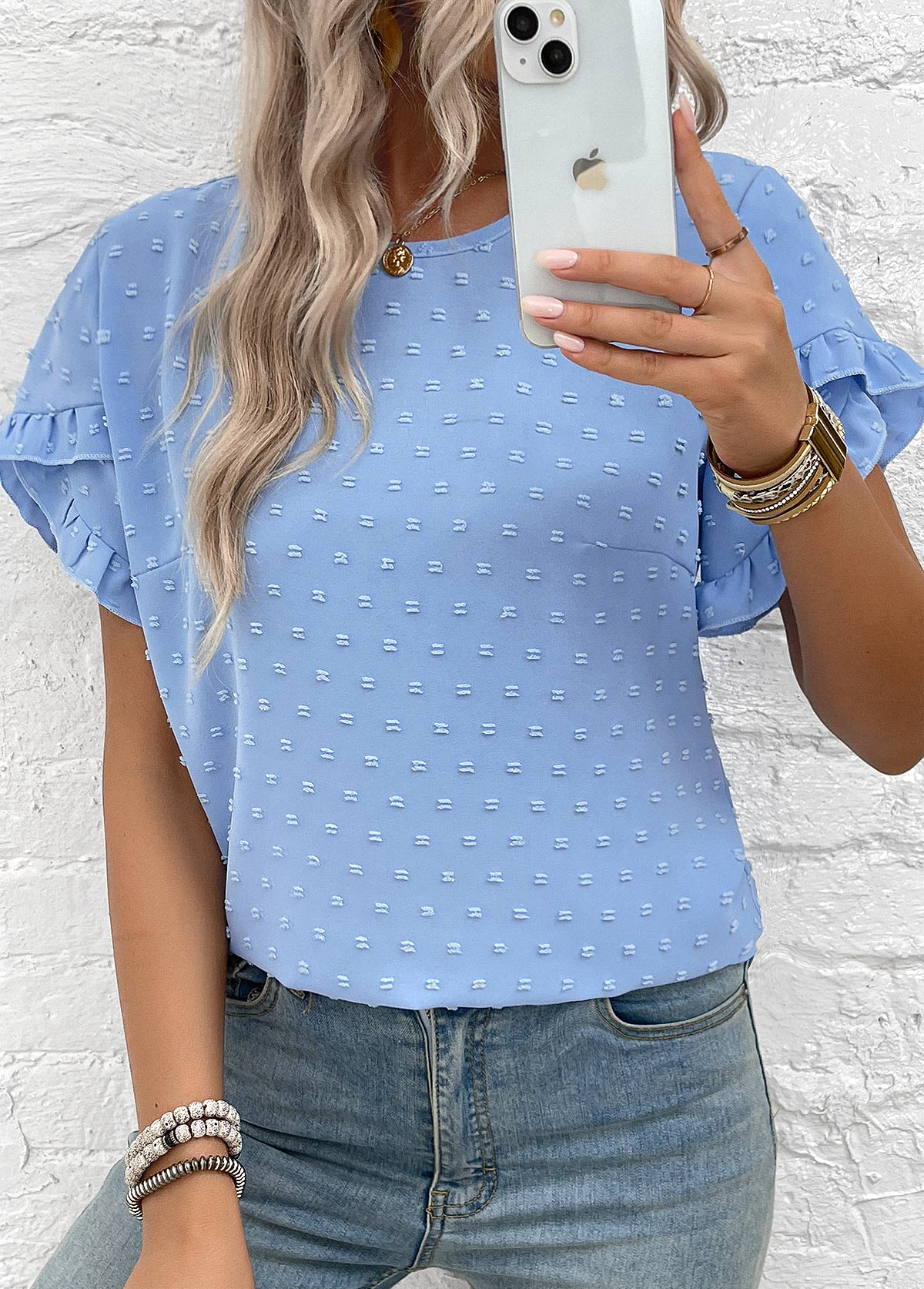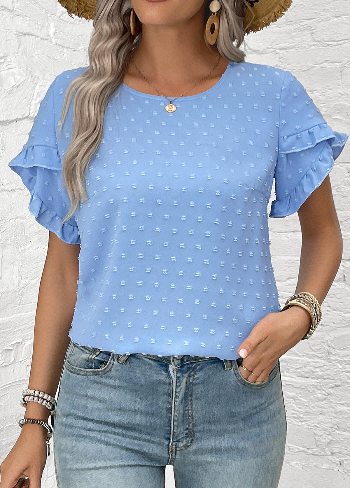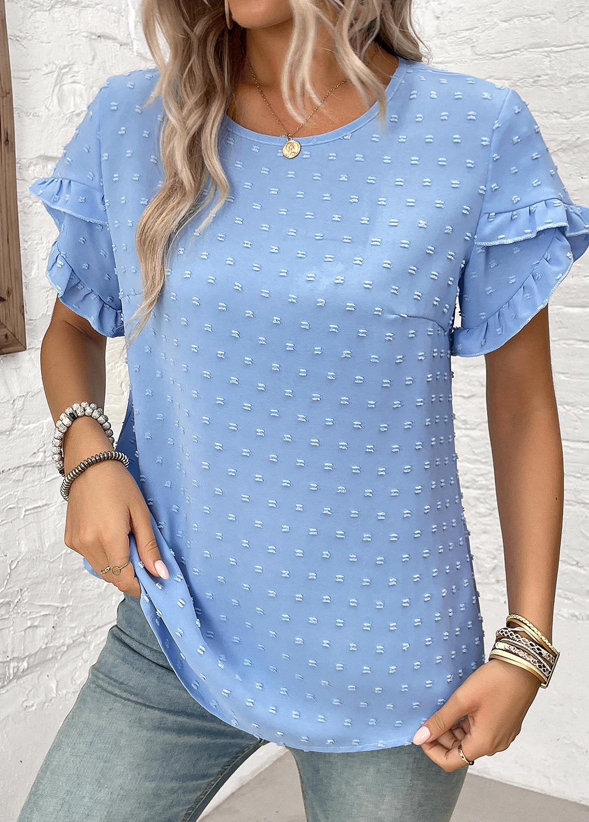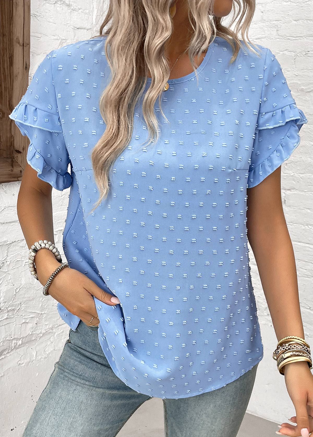 • Dusty Blue Patchwork Plus Size Short Sleeve Blouse | thumb picture