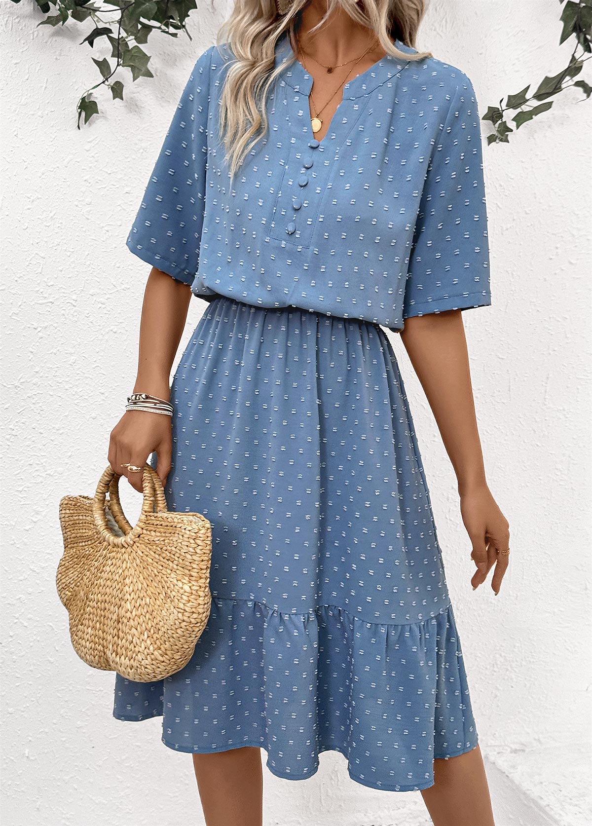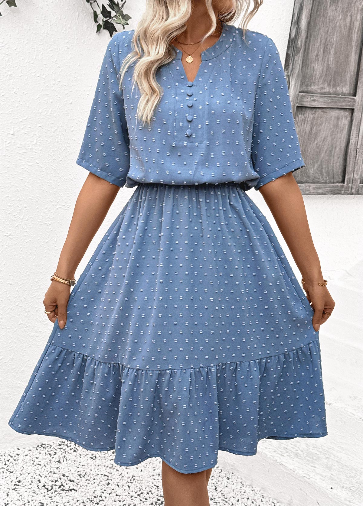 Dusty Blue Striped Shirred Short Sleeve Round Neck Dress