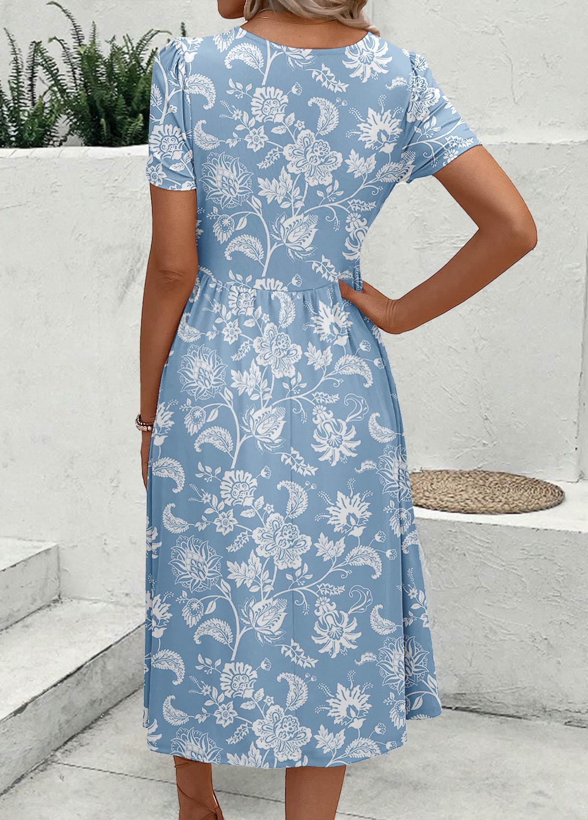 • Dusty Blue Zipper Floral Print Short Sleeve Dress | thumb picture