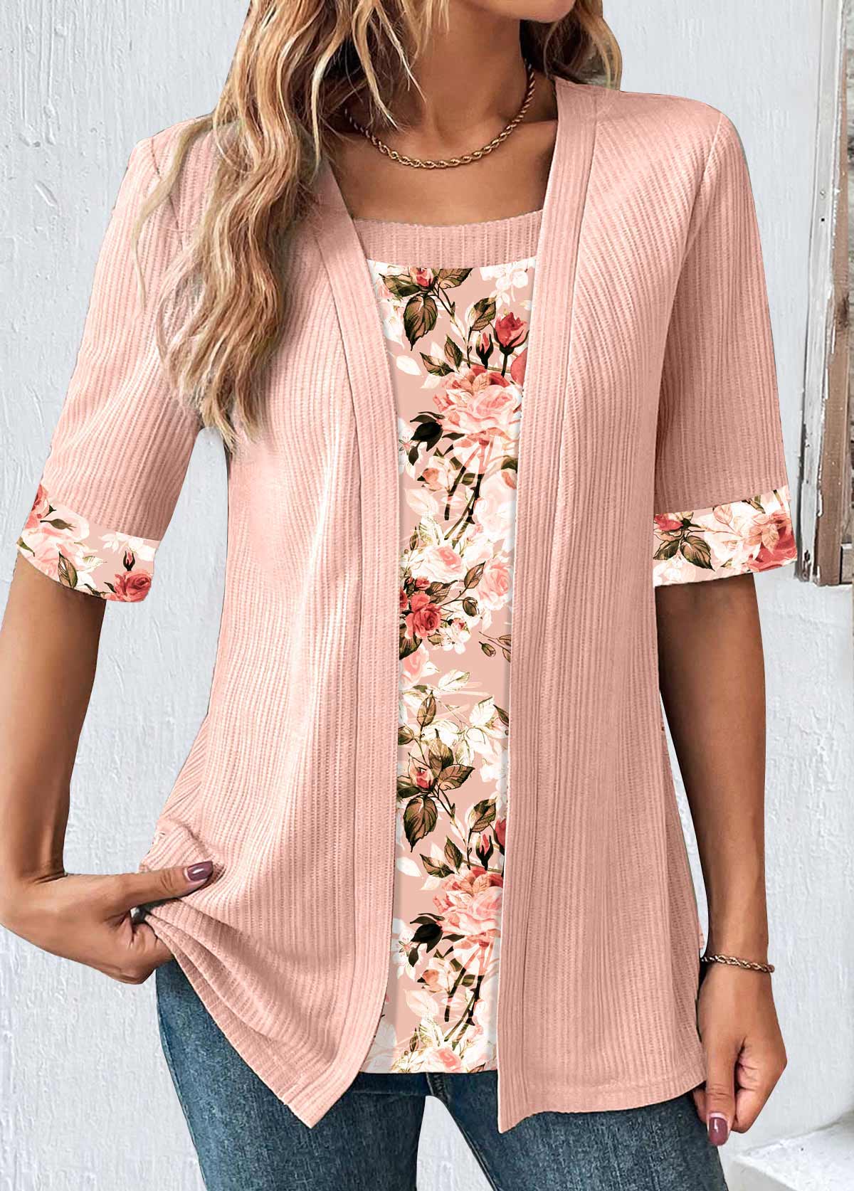 Pink Floral Print Tummy Coverage Short Sleeve T Shirt