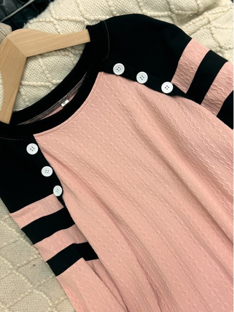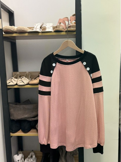 Elevate your casual wardrobe with this dusty pink sweatshirt! Featuring a stylish round neckline and striking black-pink contrast raglan sleeves, it’s a design standout. The button detail at the sleeve junction adds a unique touch. Made from soft, stretchy fabric and designed in a tunic length, it provides excellent tummy coverage for effortless everyday style.