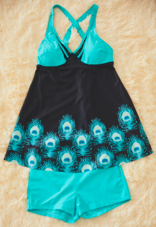 Bowknot Tropical Plants Print Cyan Tankini Set