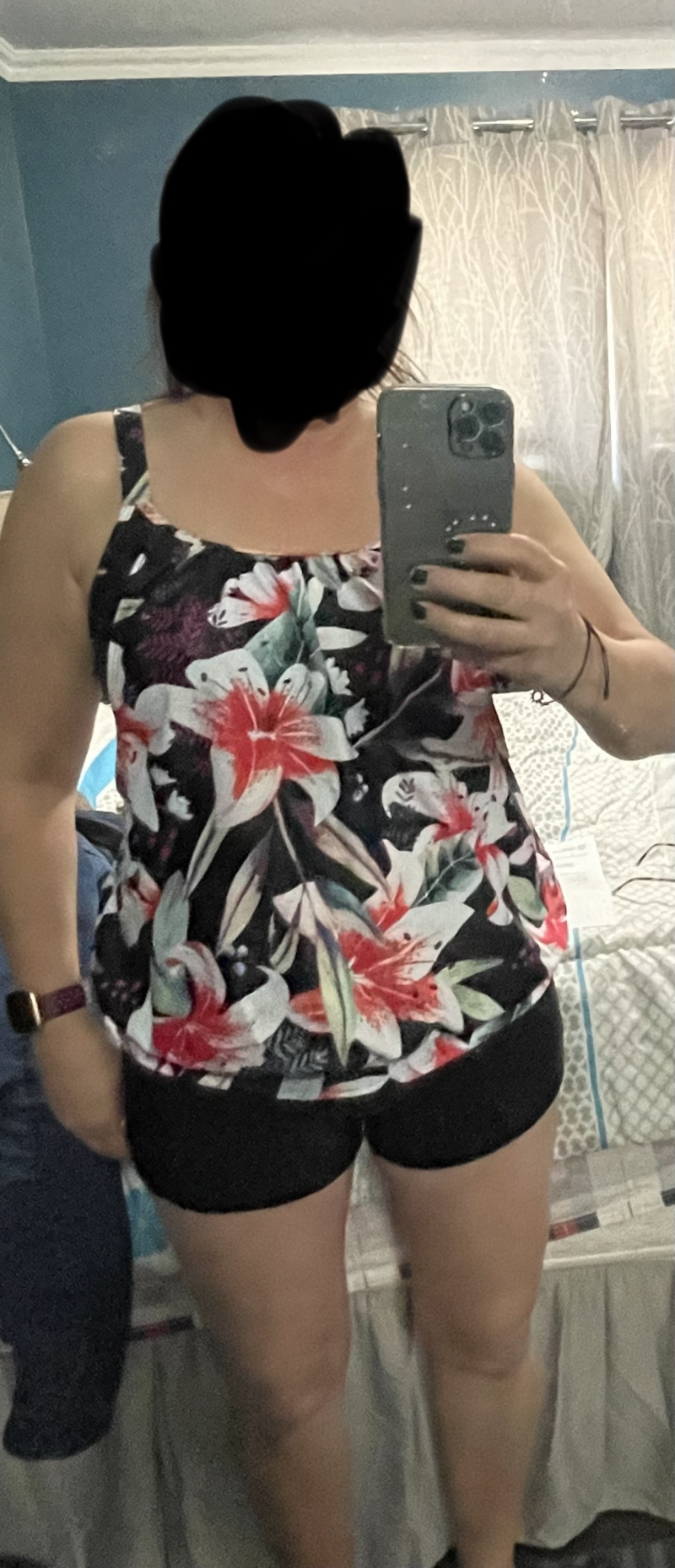 Tummy Coverage Tropical Plants Print Black Tankini Top