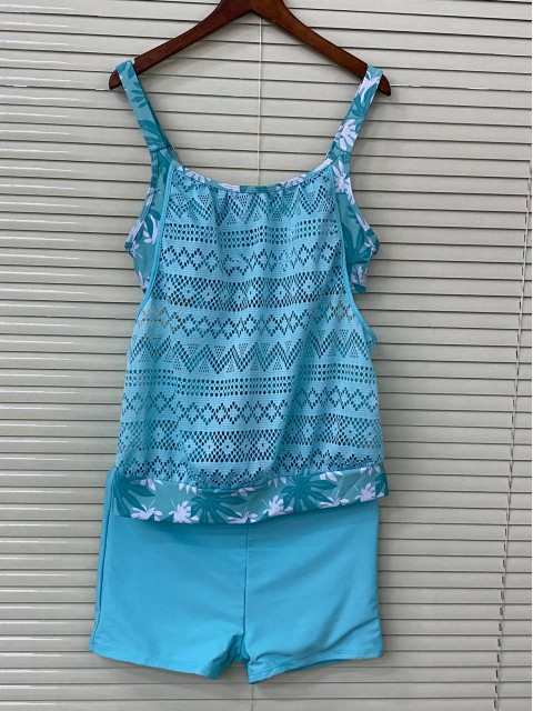 Mid Waisted Leaf Print Royal Blue Tankini Set