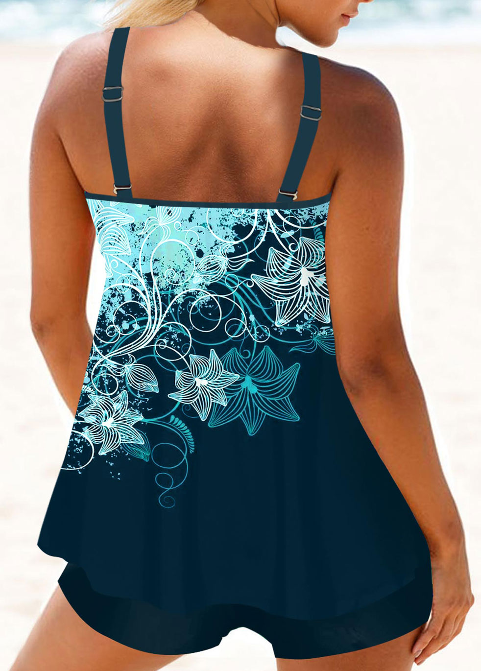 Curved Hem Cyan Tropical Plants Print Tankini Set