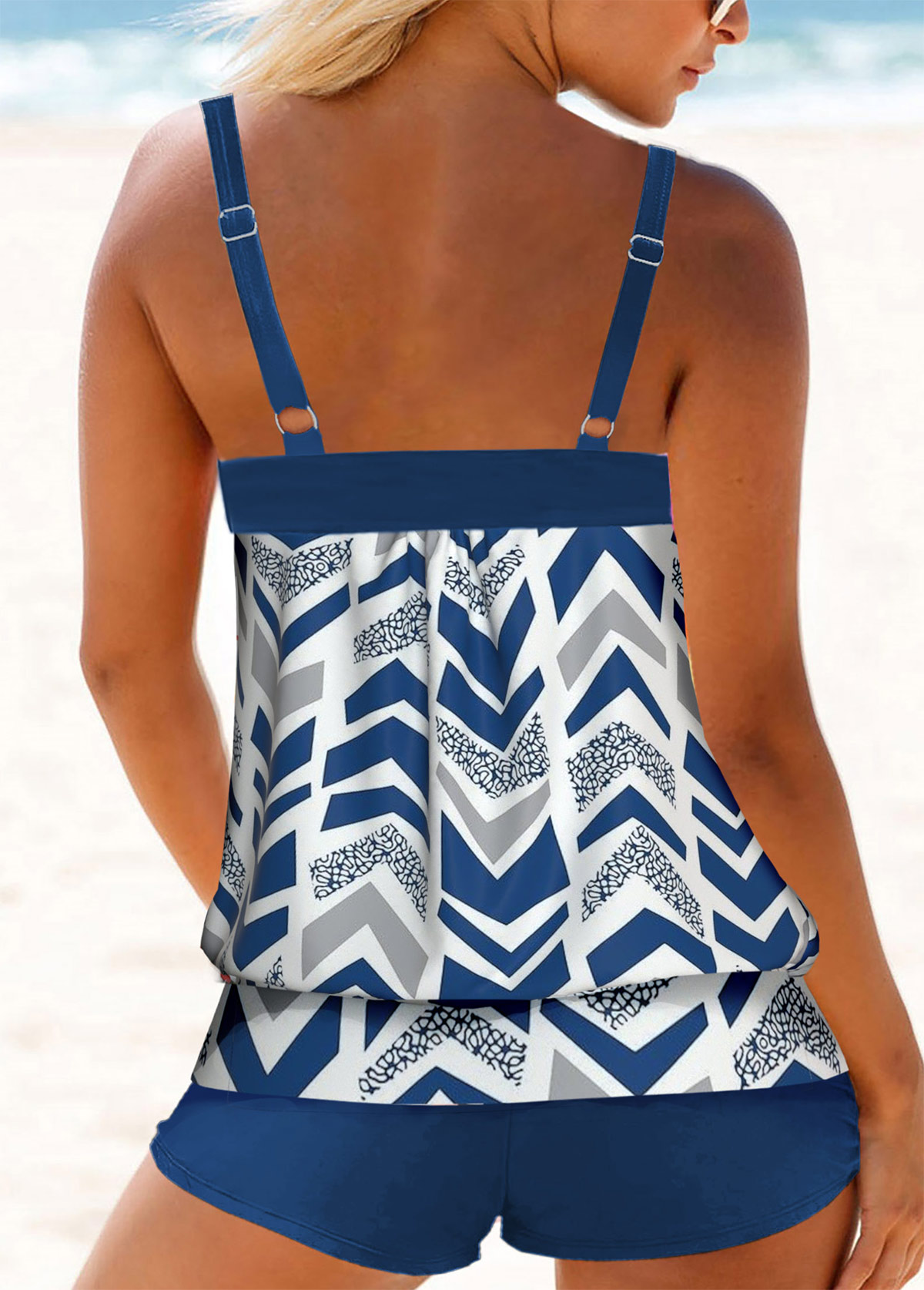 Tummy Coverage Blue Tropical Plants Print Tankini Set