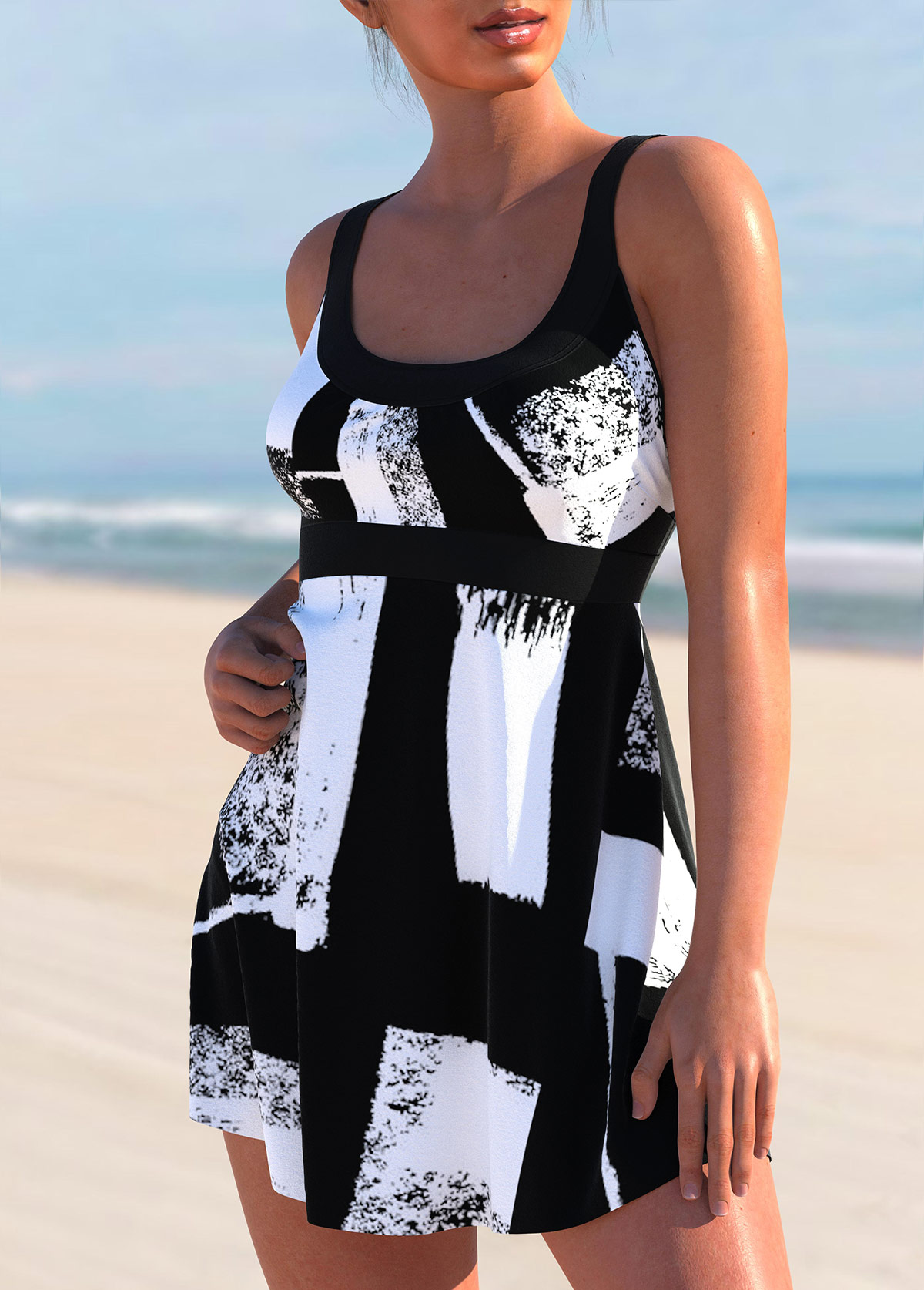Tummy Coverage Tribal Print Black Tankini Top