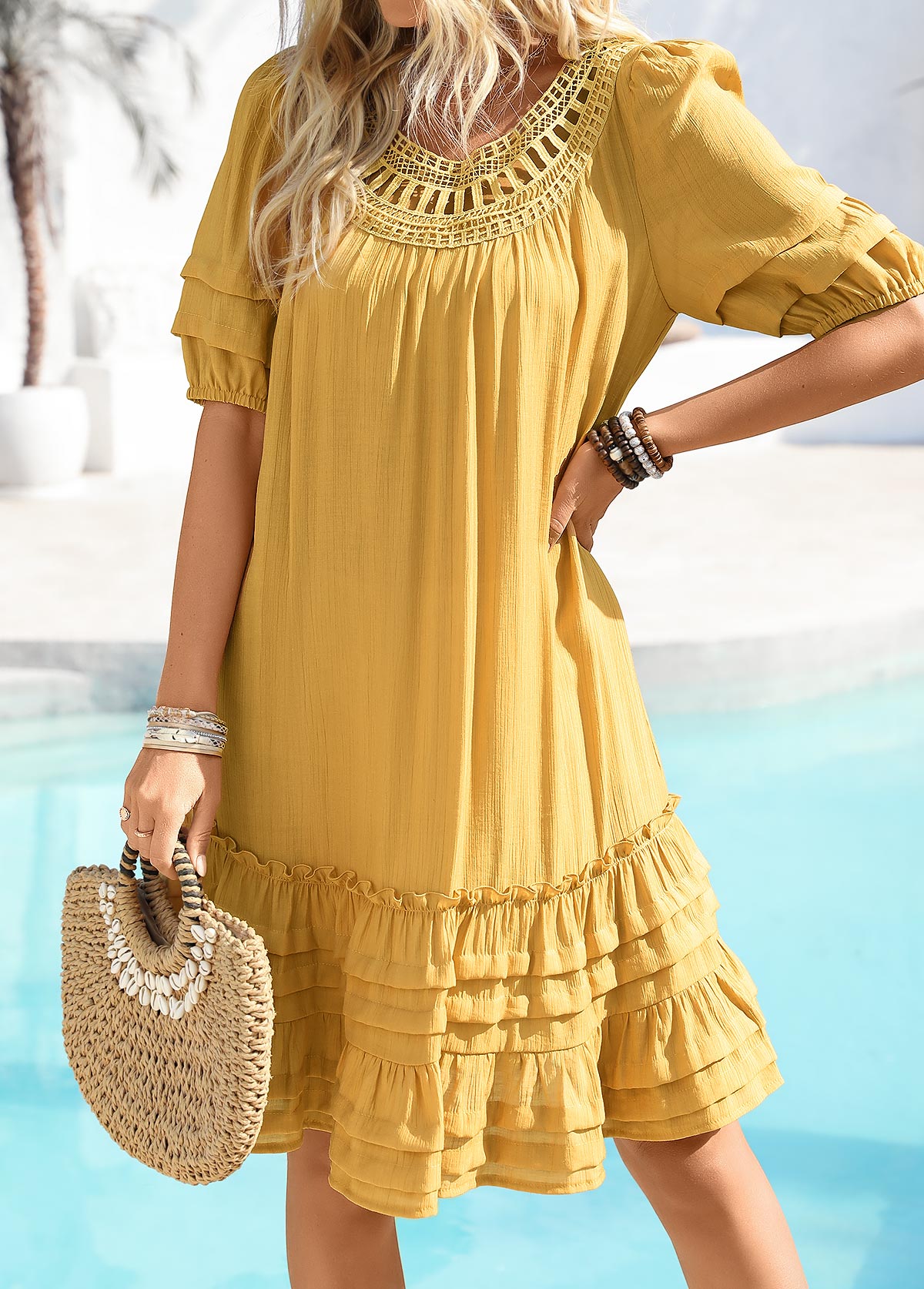 Yellow Pocket Floral Print A Line Short Sleeve Dress
