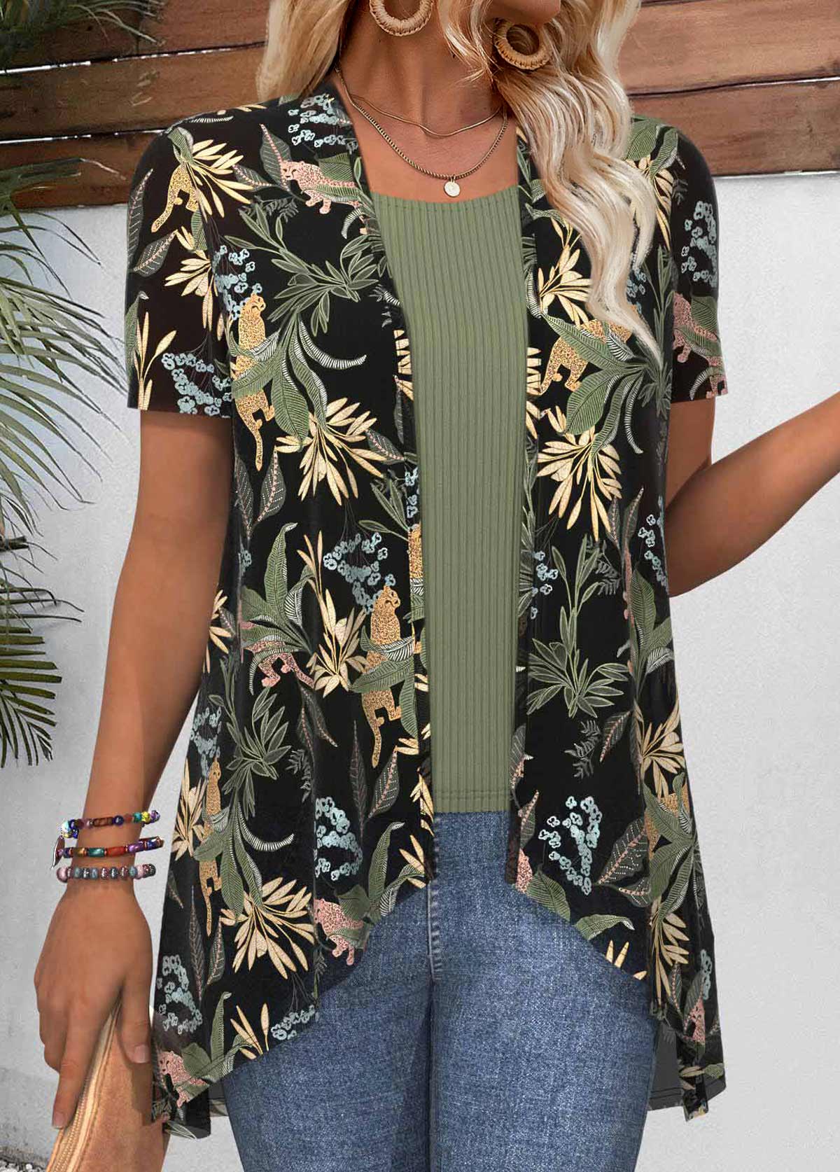 Light Green Tummy Coverage Tropical Plants Print T Shirt