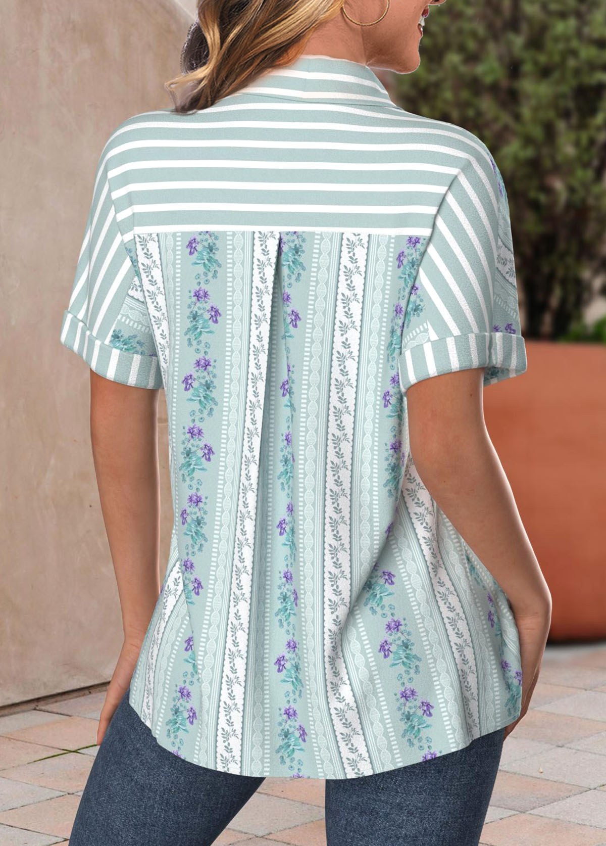 Rainbow Color Patchwork Striped Short Sleeve Shirt Collar Blouse