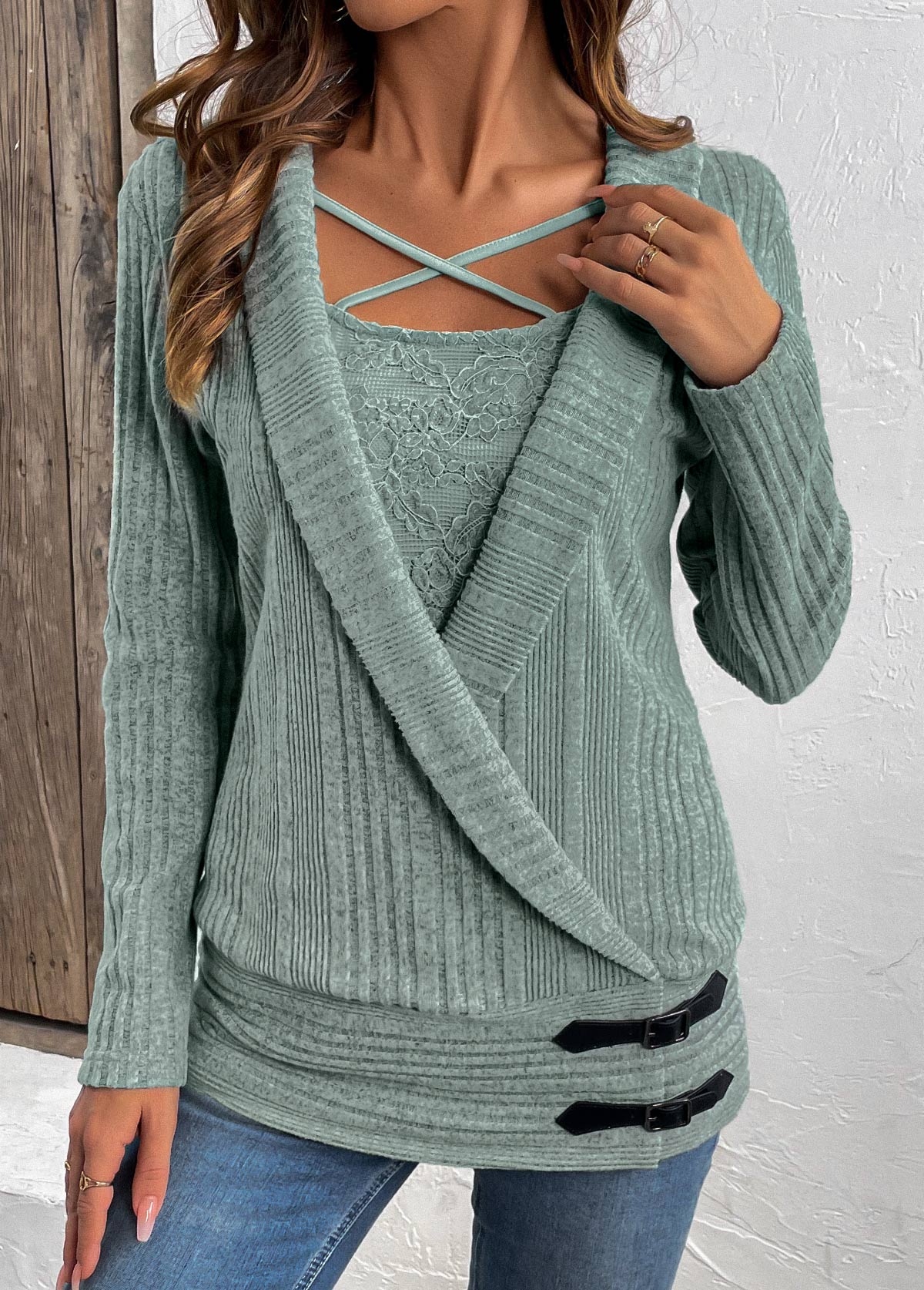 Wrap yourself in effortless style with this green surplice blouse. Featuring a flattering cross-over design at the chest with delicate lace details, it’s both chic and comfortable. The soft knit fabric and button embellishments at the bottom bring a casual, everyday charm to your wardrobe. Perfect for any occasion!
