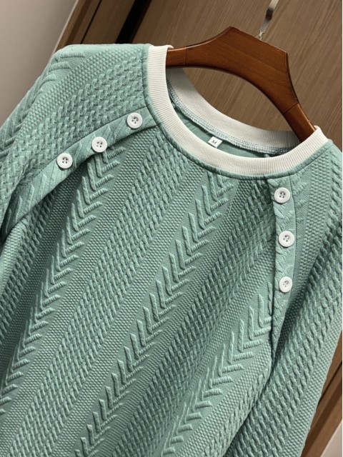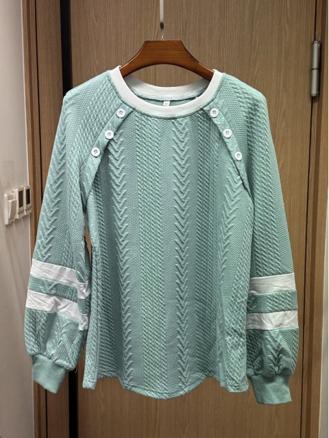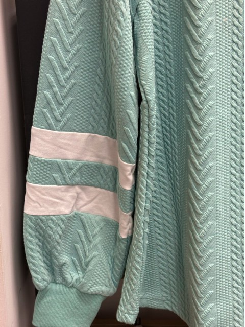 Add a pop of style to your everyday wardrobe with this green sweatshirt, featuring contrast color trim at the neckline and cuffs. The textured fabric adds depth, while the tunic length provides great tummy coverage. Perfect for blending comfort with a touch of flair.